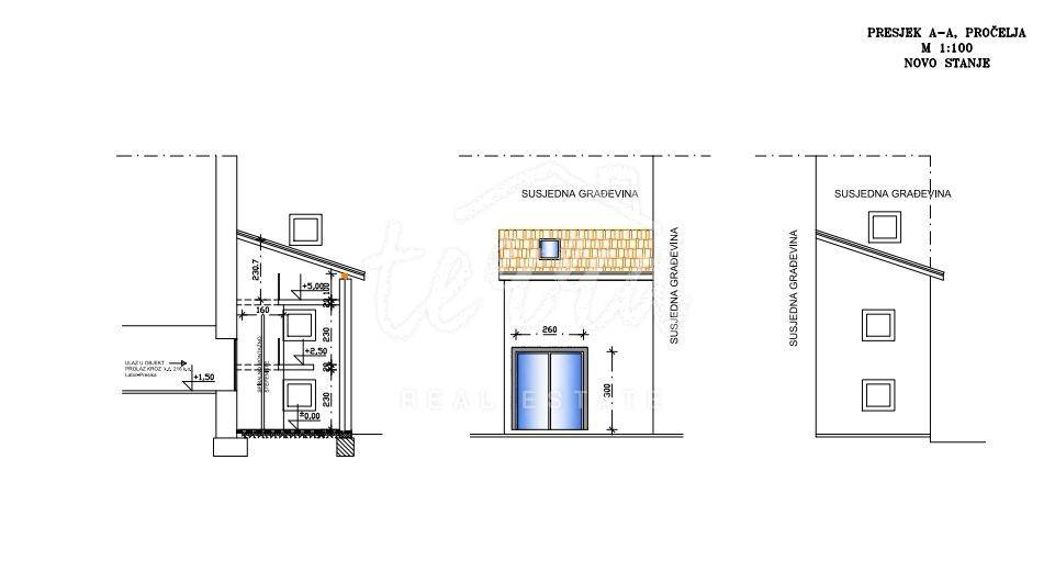 Radi se o kamenoj ruševnoj kući u nizu koja zahtijeva kompletnu adaptaciju. Kuća ima pogled na more.