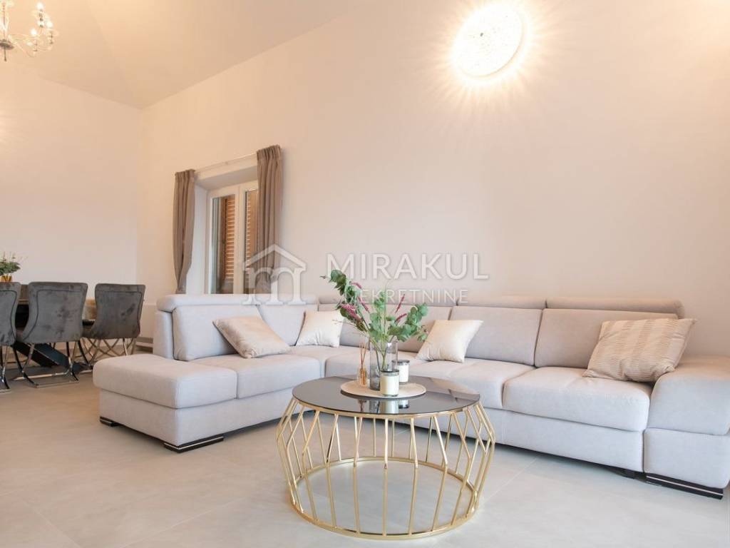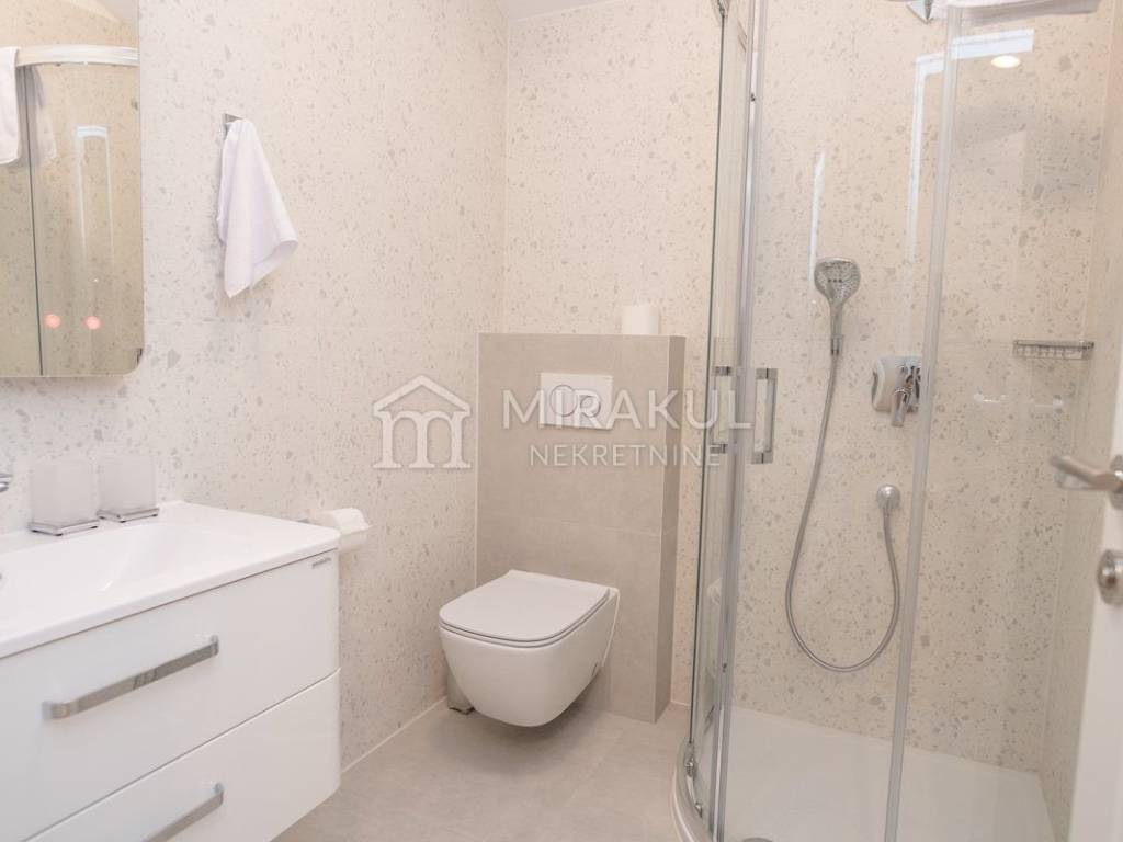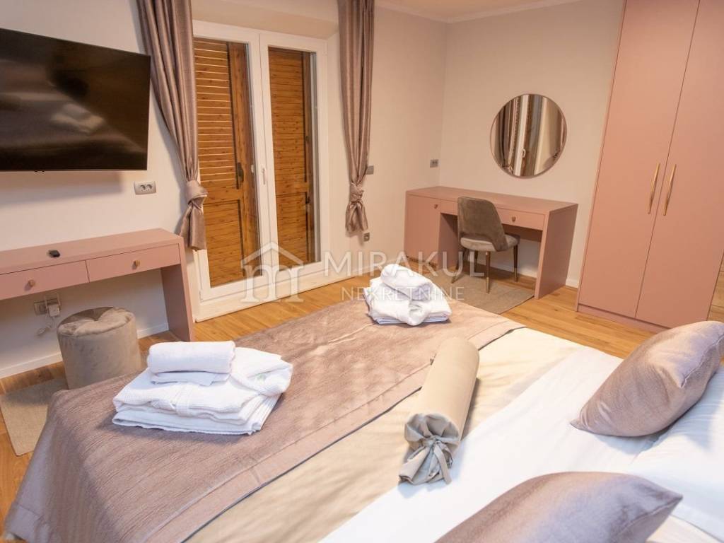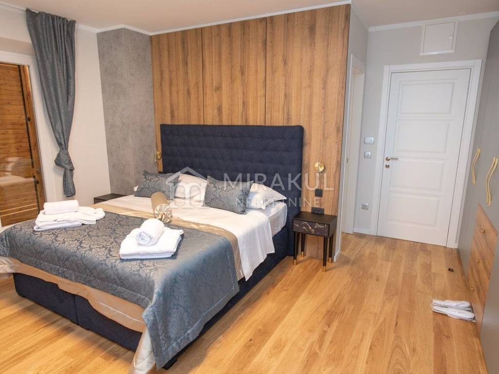 Sastoji se od hodnika, wc-a, spavaće sobe sa kupaonicom, kuhinje, blagovaonice i dnevnog boravka, te očaravajuće natkrivene terase sa prekasnim pogledom.