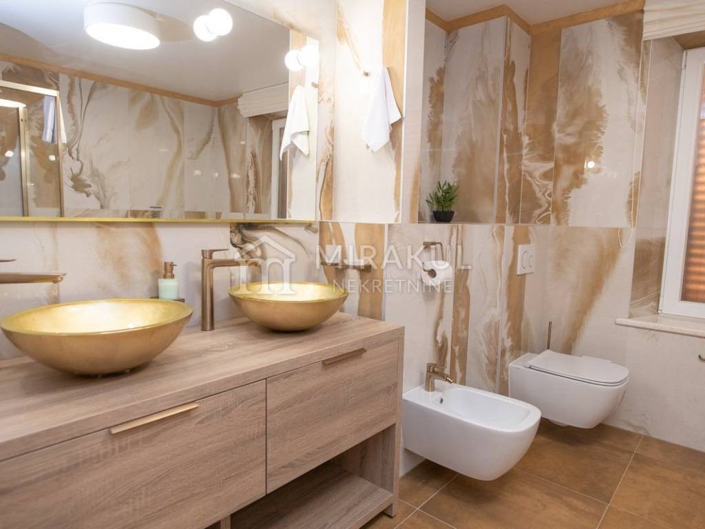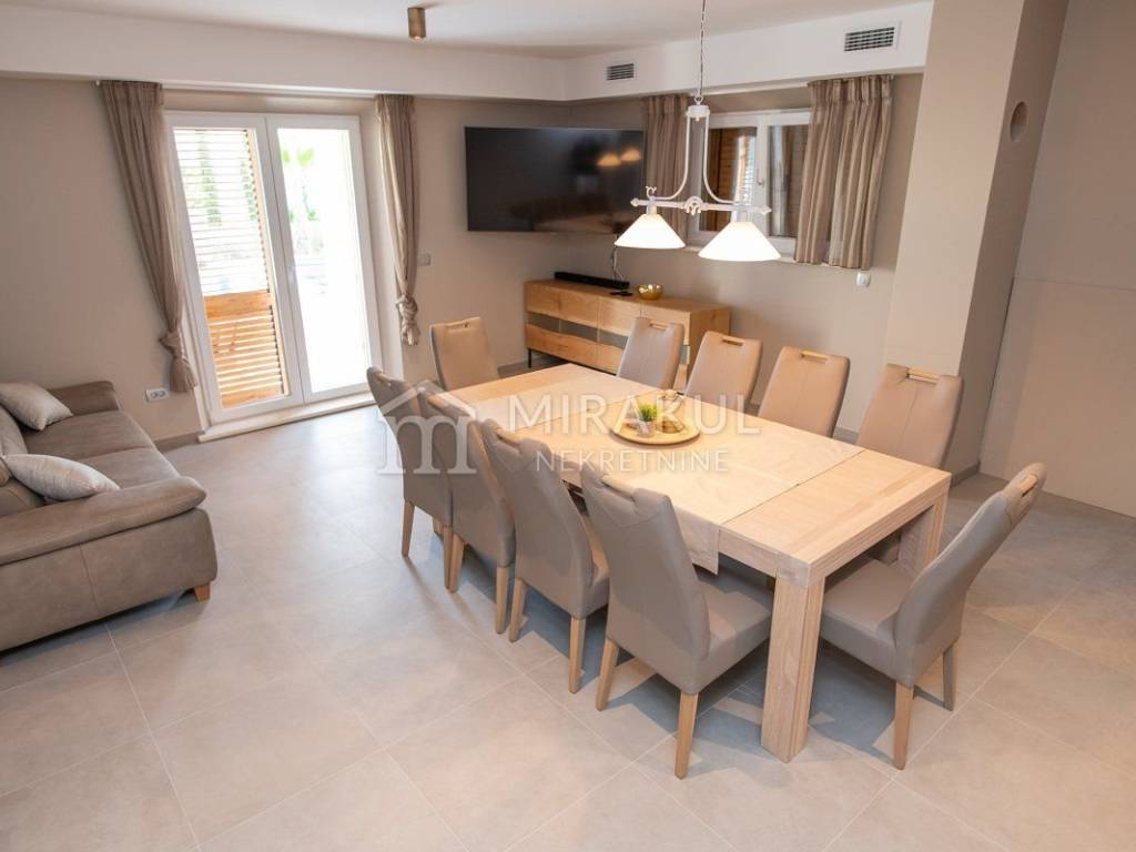 Iz suterena se izlazi na dvorišni dio gdje se nalazi prekrasno uređen vrt u mediteranskom stilu, te prostrani bazen od 61m2.