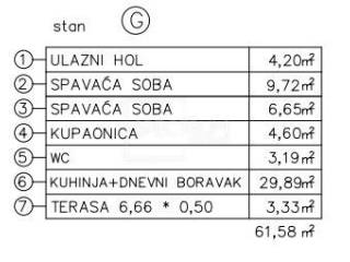 Stan se nalazi na 2.katu novoizgrađene stambene zgrade sa 11 stambenih jedinica. Površina stana iznosi 61.58 m2. Stan se sastoji od dnevnog boravka sa kuhinjom i blagovaonicom open space koncepta, 2 spavaće sobe, kupaonice, wc-a, hodnika i natkrivene terase. Na terasu se dolazi iz kuhinje. Sa terase se pruža pogled na Tar i na prirodu.