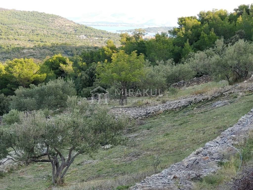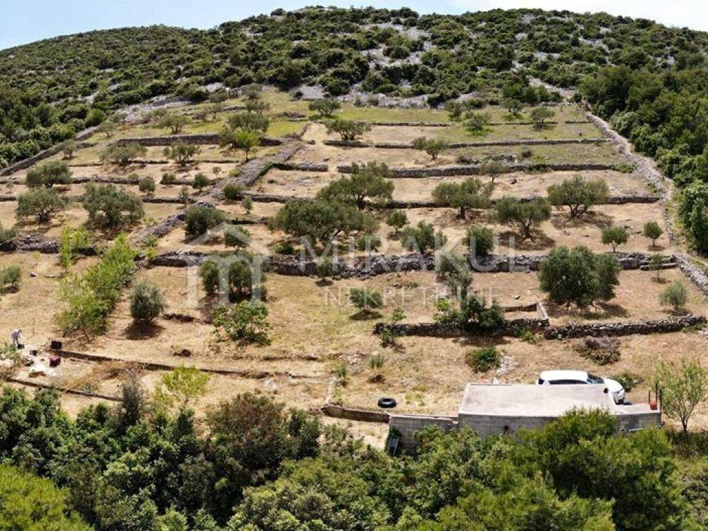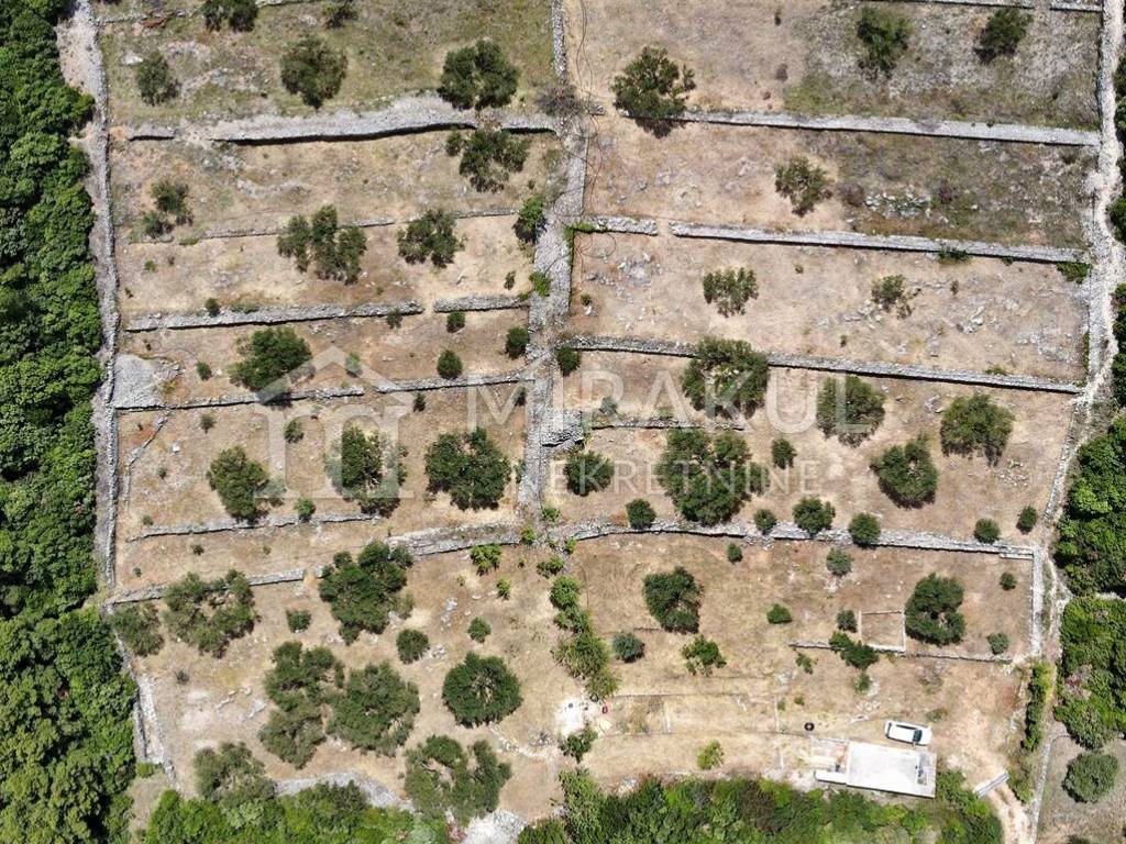 Na zemljištu se nalazi 100 maslina od toga polovica starih, puno badema, smokve i dva šipka. Sva stabla su obrađivana i na rodu. Kompletno je uređen, te opremljen navodnjavanjem kap na kap. Površina: 9.883 m2 Na zemljištu se nalazi legalizirani objekt u rohbau fazi s gusternom. Dodatno na zemljištu se nalazi još jedan bunar.