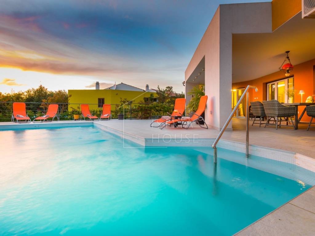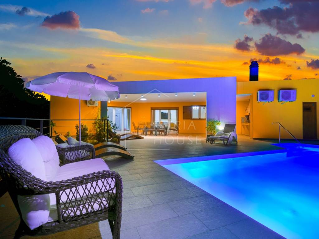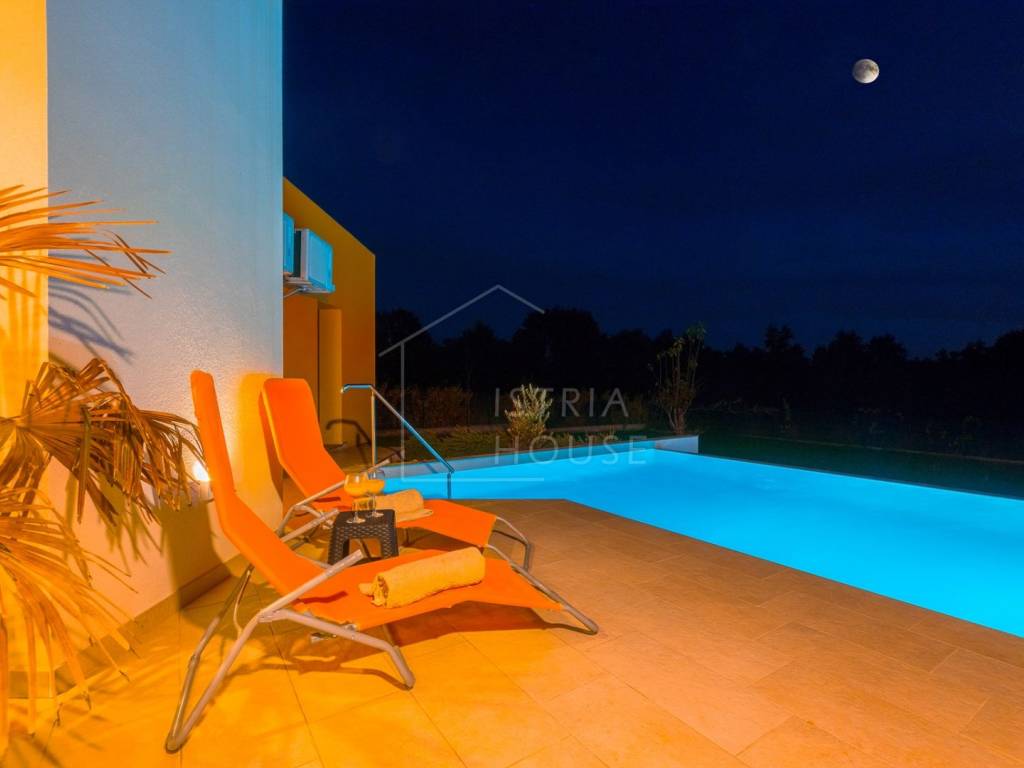 Kuća je prizemna i samostojeća, izgrađena u modernom stilu te je unutrašnjost uređena sa visokim ukusom pazeći na detalje koji istu naglašavaju. Sastoji se od tri spavaće sobe svaka sa svojom kupaonicom, dnevnog boravka, te kuhinje sa blagavaonom. Vila posjeduje i saunu te je cijela klimatizirana. Iz blagavaone te dnevnog boravka pruža se pogled te ulazi na prostranu vanjsku natkrivenu terasu sa izgrađenim kaminom idealnu za obiteljska druženja ali i za zabave. Uz terasu tu je i veliki bazen sa svojim ležaljkama za odmor i opuštanje.