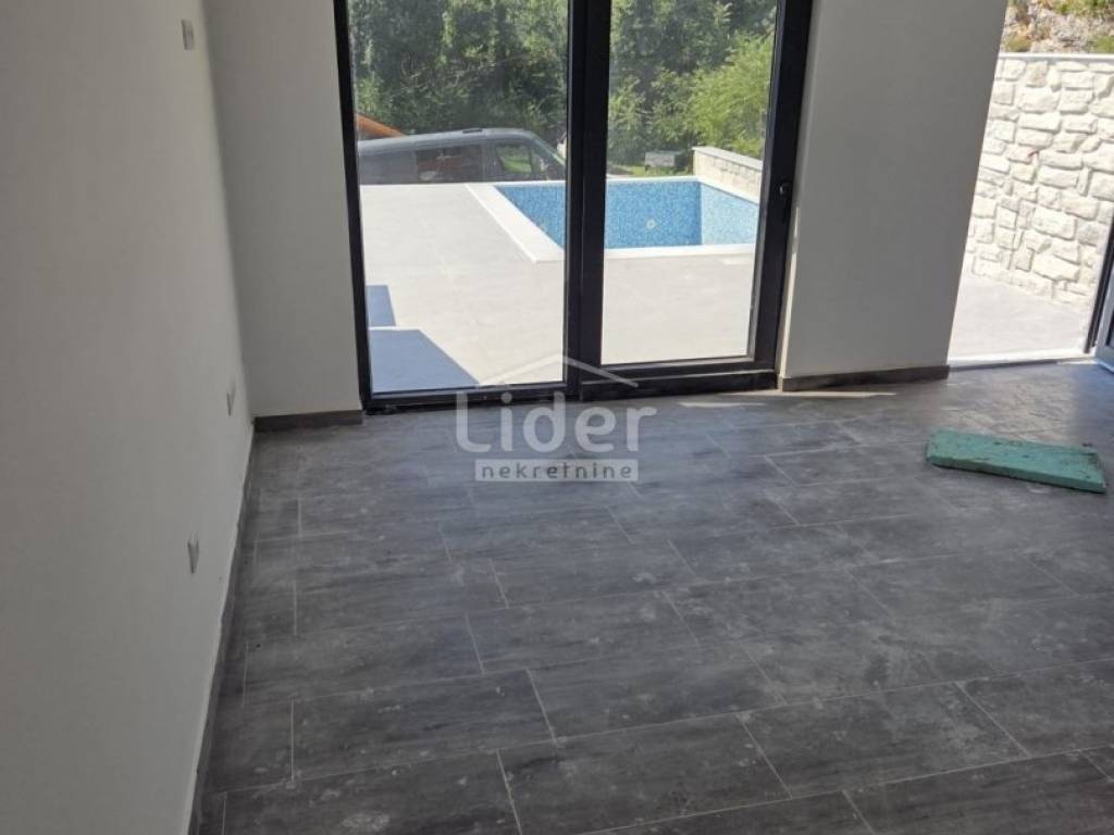 U prizemlju se nalaze dnevni boravak, kuhinja i terasa od 20 m2 sa sunčalištem pored bazena (dimenzija 5,5 x 3,5 metara), a na katu dvije spavaće sobe s kupaonom.