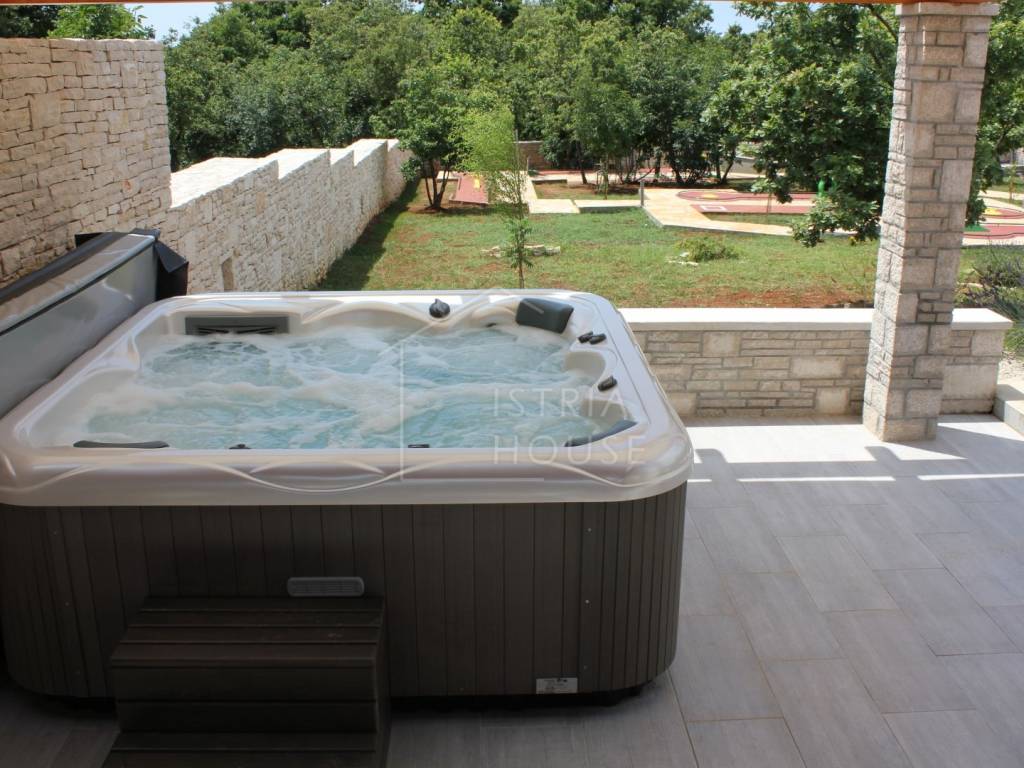 Na vanjskom dijelu objekta smješten je grijani bazen od 36m2, terasa od 100m2 oko bazena, natkriveni grill kamin sa stolom za sjedenje, natkriveni parking za 2 automobila te još dodatni parking za 2 vozila.