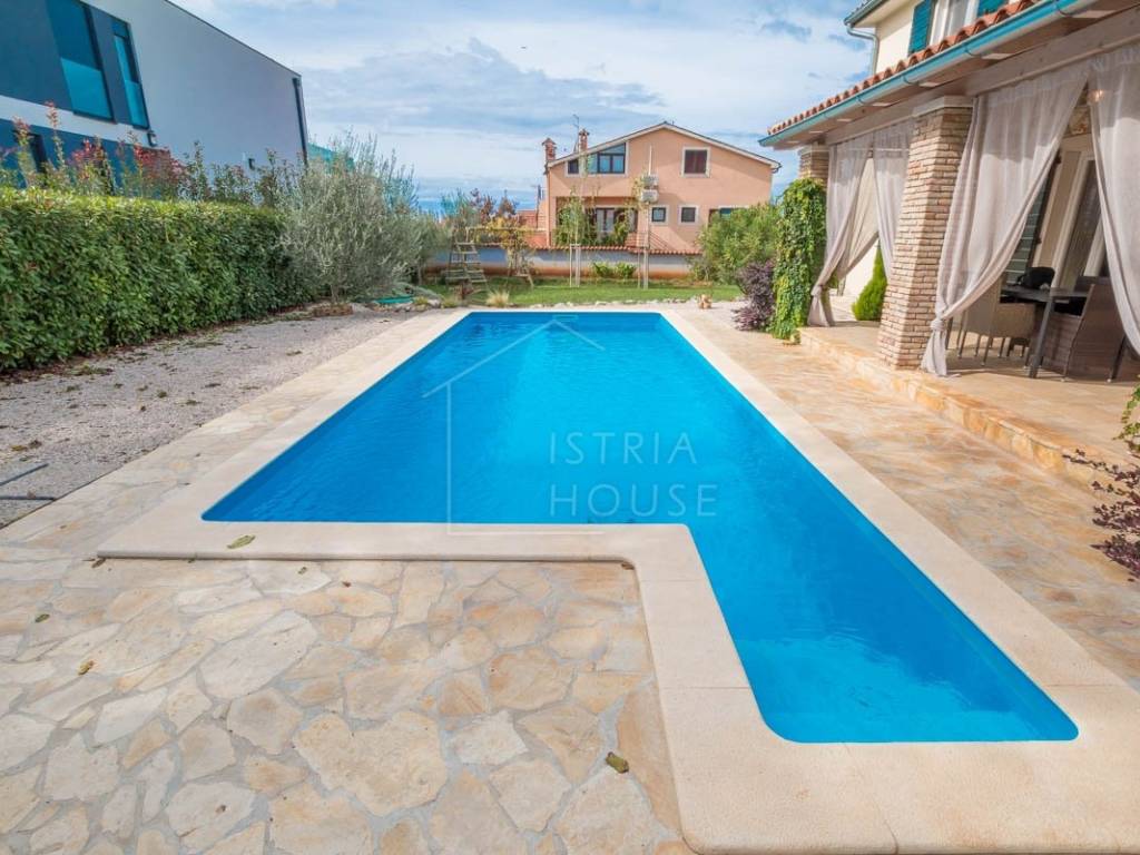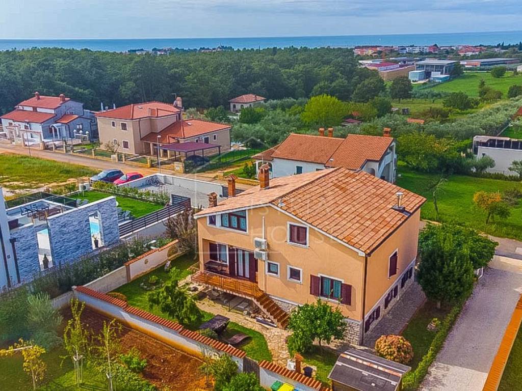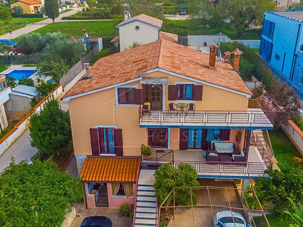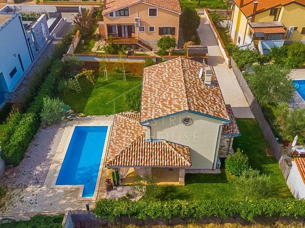 Prva kuća je površine 120m2 i proteže se na dvije etaže. U prizemlju nalazimo dnevni boravak sa izlazom na natkrivenu terasu, kuhinju sa blagovaonicom i wc, dok na katu lijepe vile nalaze se dvije sobe sa zasebnim stepenicama i kupaonicama. Svaka soba ima klima uređaj i podno grijanje u kupaonicama te se kuća grije i putem peći na pelete. Dvorište je lijepo uređeno sa velikim bazenom, natkrivenom terasom i velikim parkingom.