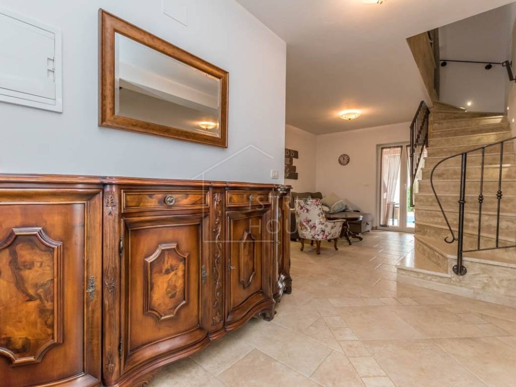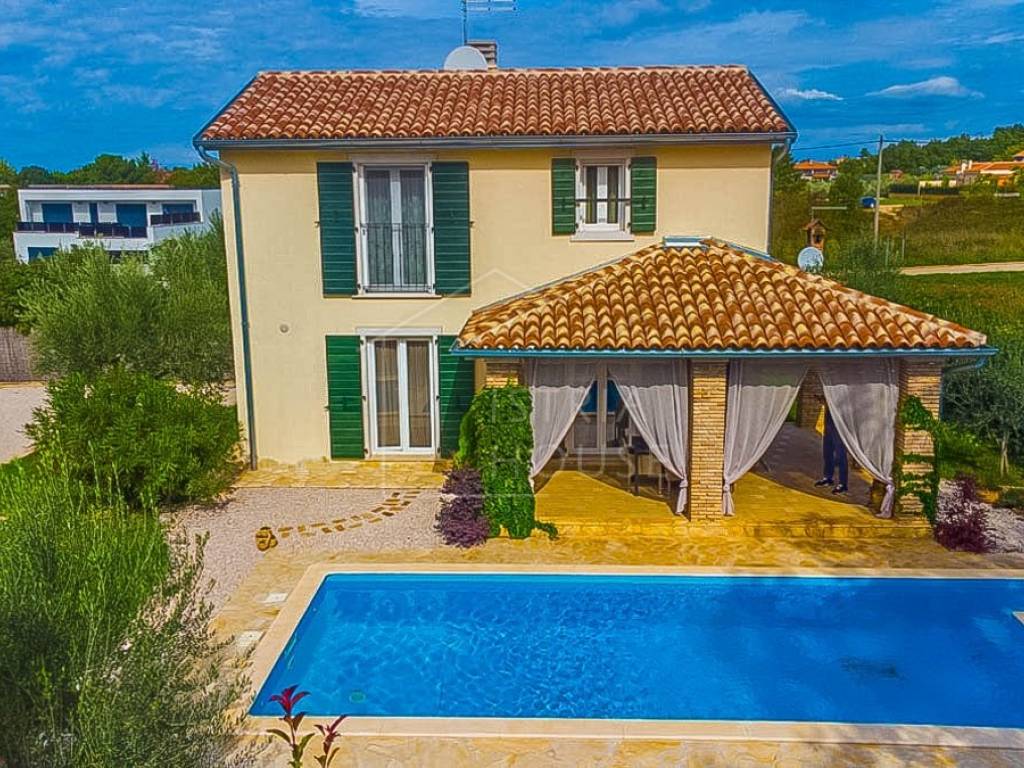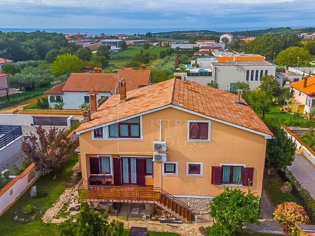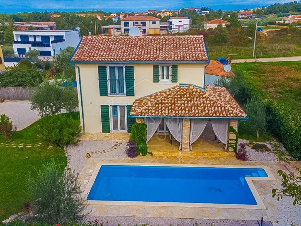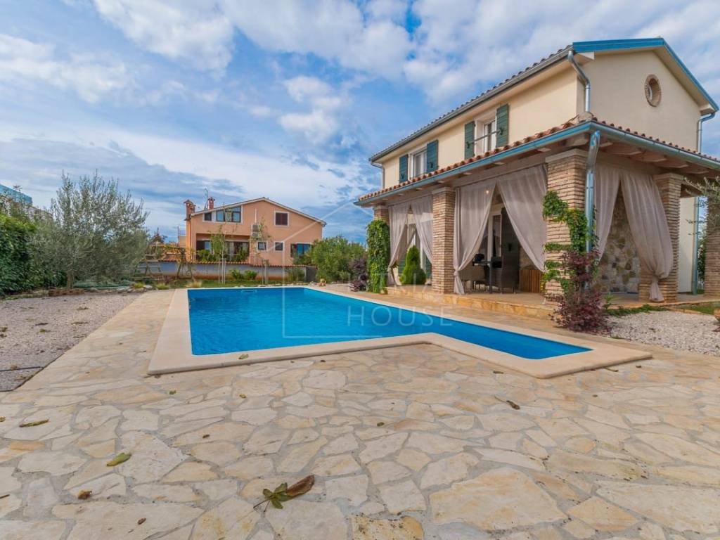 Prva kuća je površine 120m2 i proteže se na dvije etaže. U prizemlju nalazimo dnevni boravak sa izlazom na natkrivenu terasu, kuhinju sa blagovaonicom i wc, dok na katu lijepe vile nalaze se dvije sobe sa zasebnim stepenicama i kupaonicama. Svaka soba ima klima uređaj i podno grijanje u kupaonicama te se kuća grije i putem peći na pelete. Dvorište je lijepo uređeno sa velikim bazenom, natkrivenom terasom i velikim parkingom.