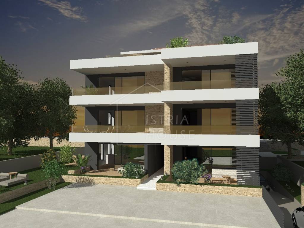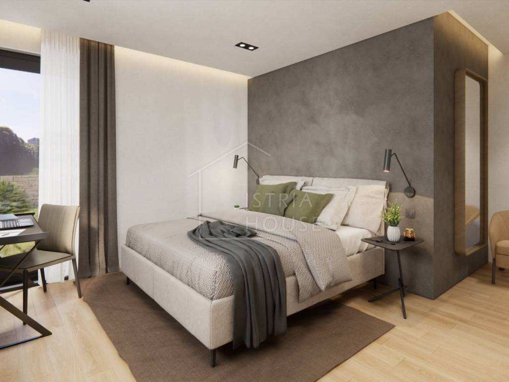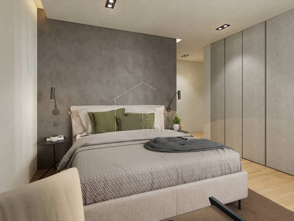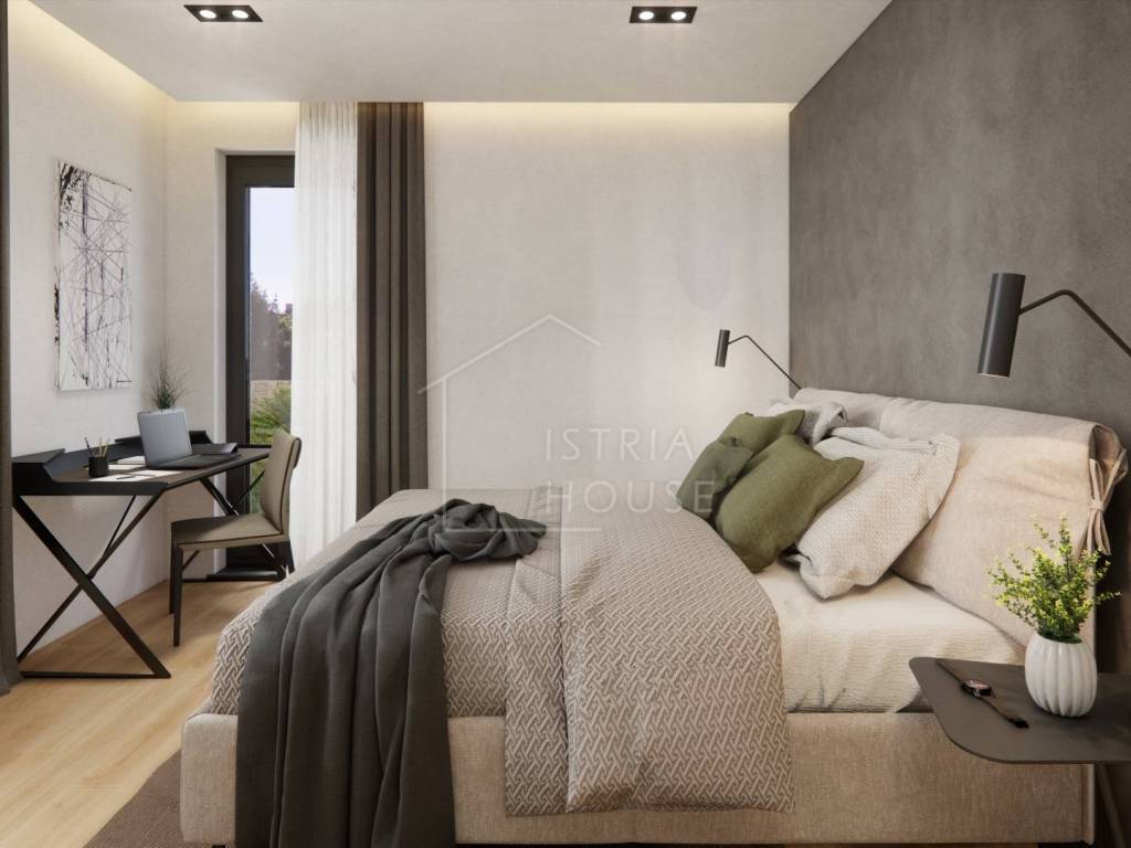 sobe, svaka sa svojom kupaonicom i garderobom. Kuhinja , blagavaona i dnevni boravak čine jednu prostoriju okrenutu prema vanjskoj svjetlosti, odnosno prema terasi i prema vrtu koji pripada stanu. Stan ima još gostinjski wc, garažu, ostavu te vanjsko parkirno mjesto.