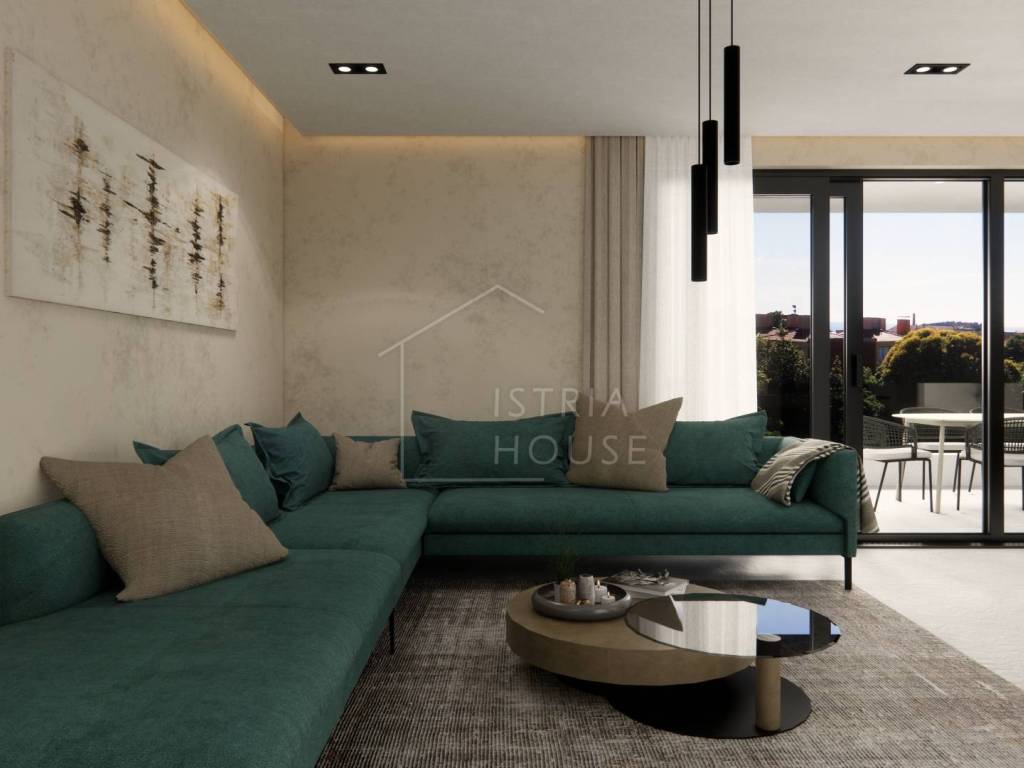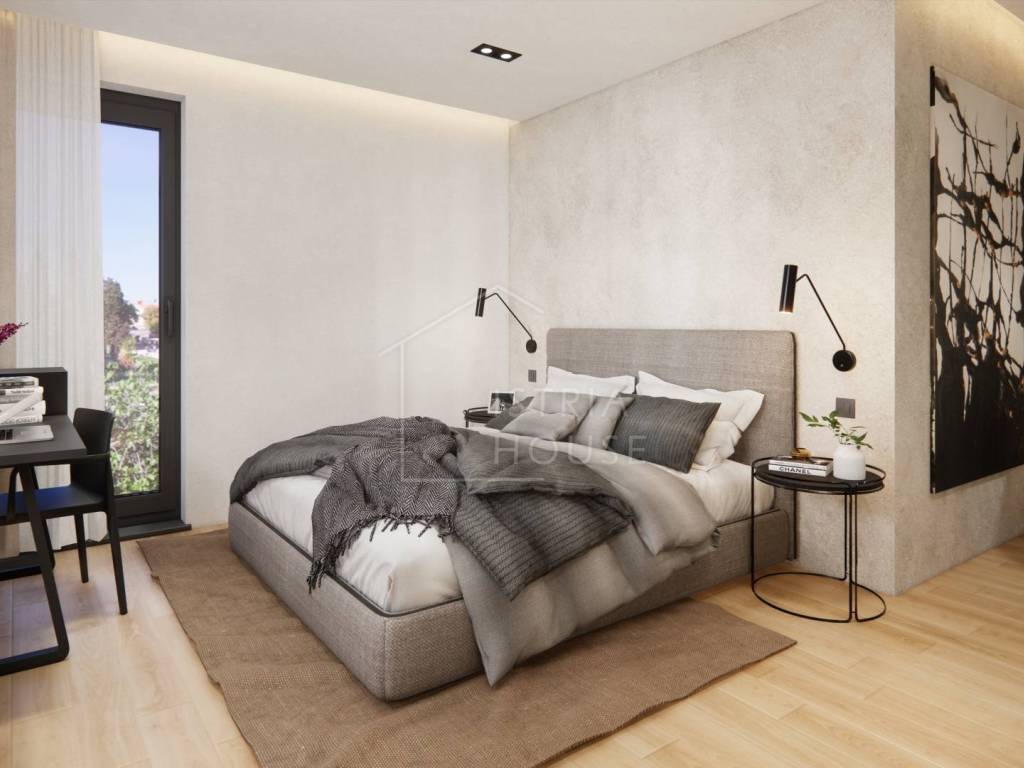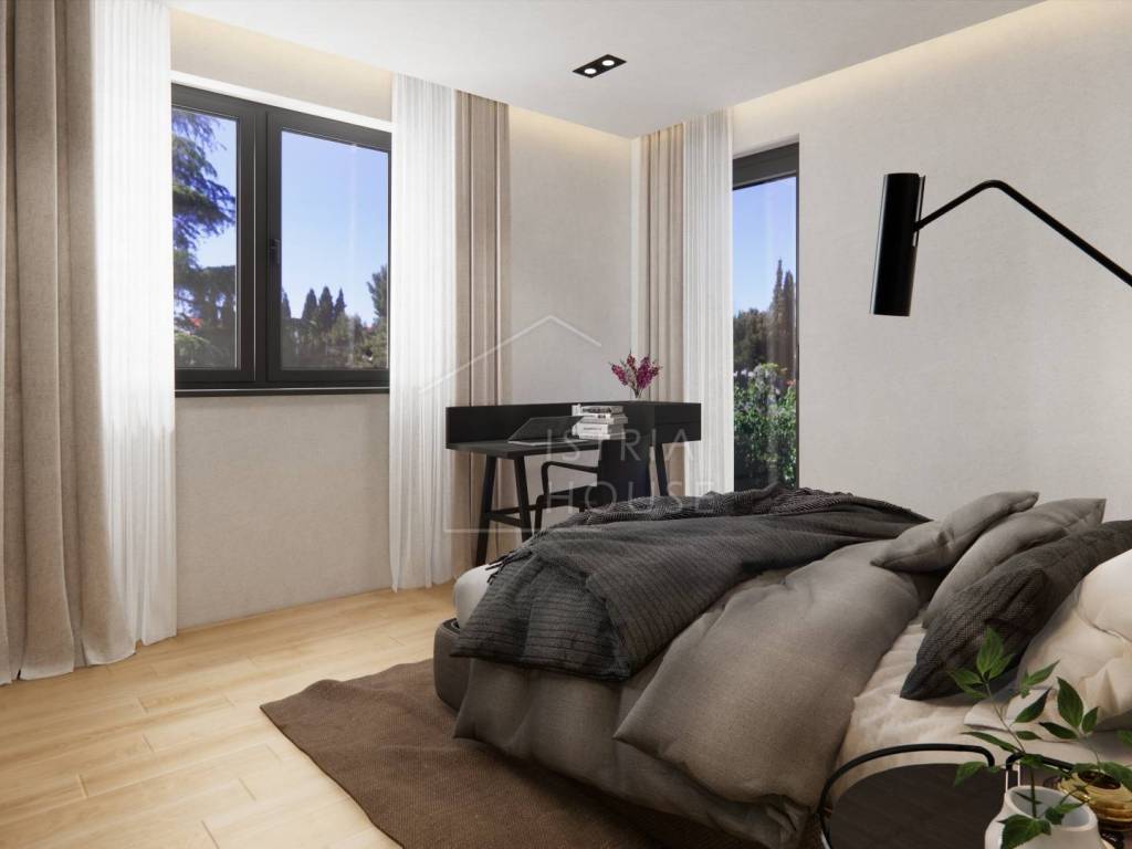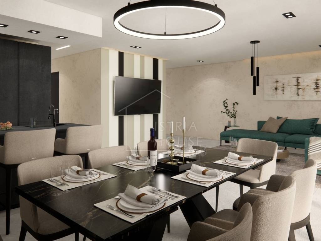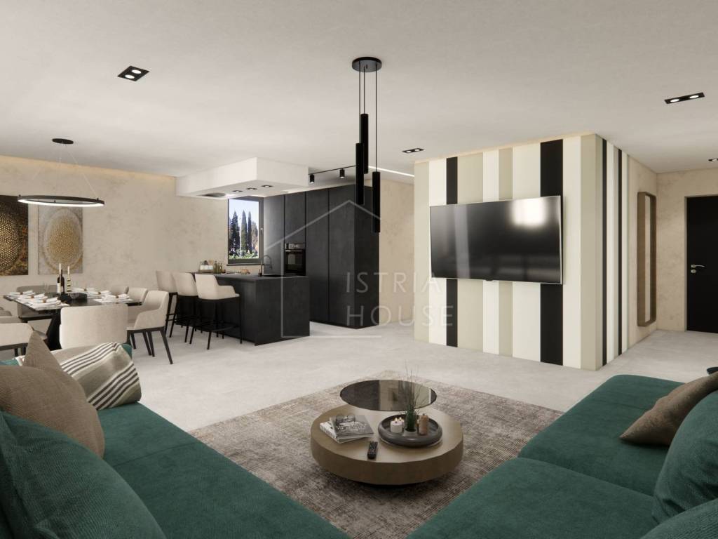 Stan se prodaje nenamješten, osim kupaonice i podova koji će biti kompletno opremljeni. Budući kupac, ukoliko mu se sviđaju slike namještaja korištenog u vizualizaciji, ima mogućnosti da mu se stan opremi identičnim namještajem.