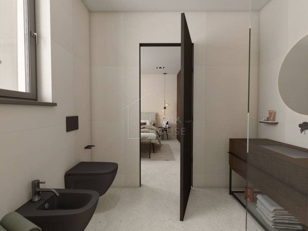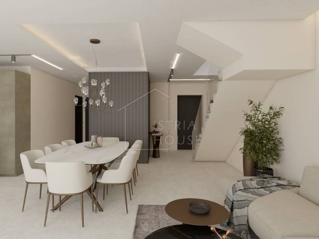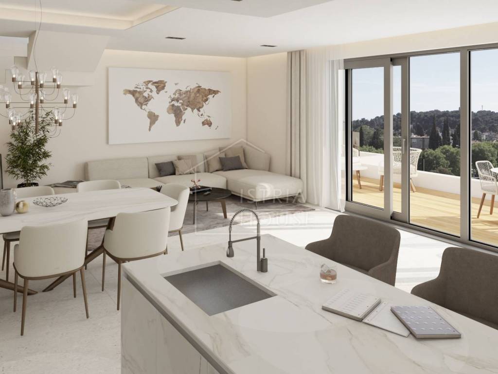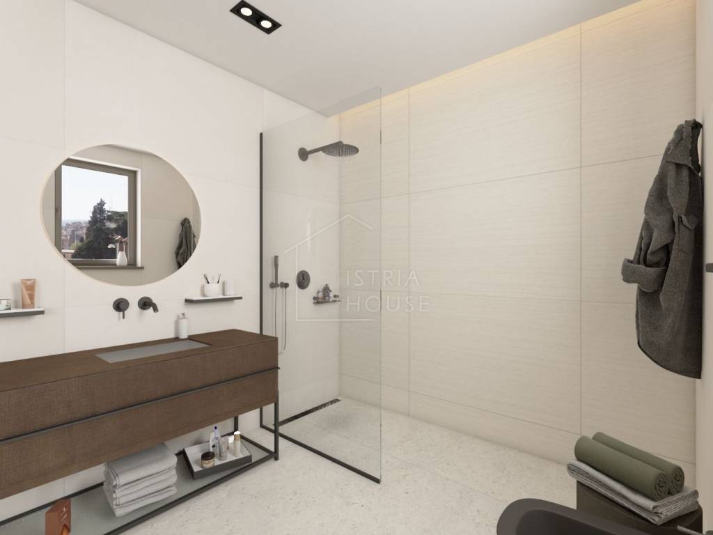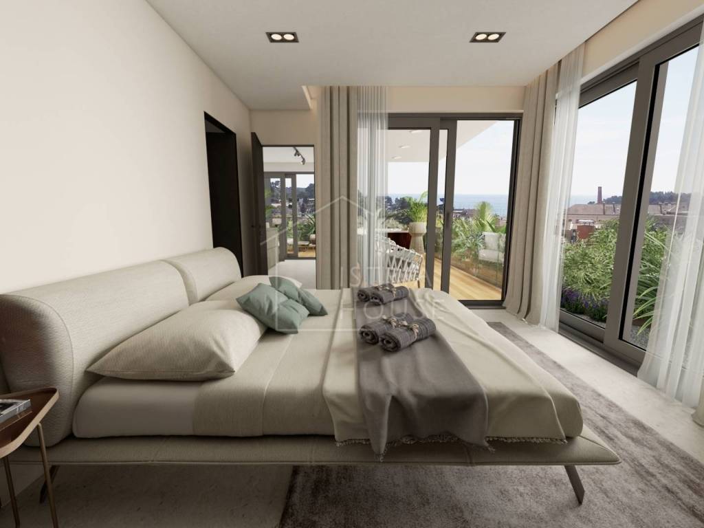 U ovom bajkovitom gradu prodajemo dvoetažni stan u izgradnji na vhu zgrade nedaleko gradskog centra ukupne površine 198,91 m2. Stan se sastoji od glavnog dijela površine 130,77 te mansarde iznad od 68,14 m2. Nakon kompletne izgradnje stan će raspolagati sa tri spavaće sobe od kojih svaka ima svoju kupaonicu i svoju garderobu, jednog gostinjskog WC-a, ostave, te jednog jedinstvenog prostora kojeg će sačinjavati kuhinja, dnevni boravak te blagavona i biti će okrenute prema terasi sa koje će se pružati pogled na grad Rovinj te na morsko plavetnilo.