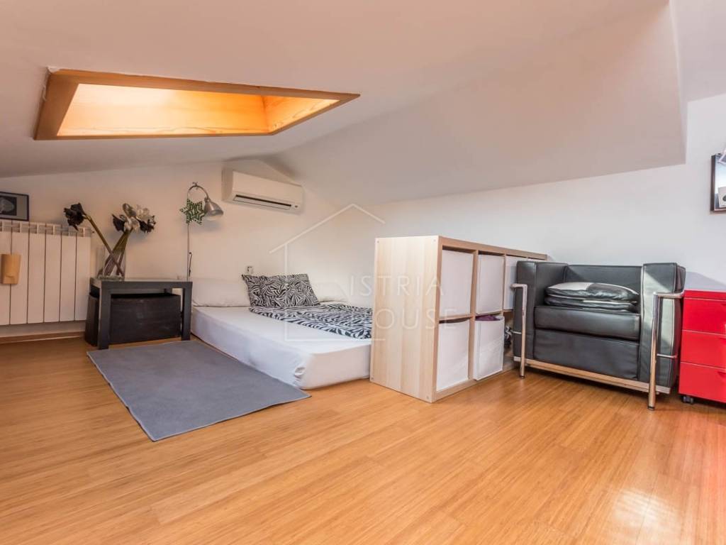 Stan od 83m2 prostire se na dvije etaže. Na prvoj etaži nalazi se lijepi dnevni boravak iz kojeg se izlazi na terasu s pogledom na more, kuhinja s blagovaonicom, prostrana soba i kupaonica, dok na drugoj etaži (mansarda) nalazimo sobu i wc.