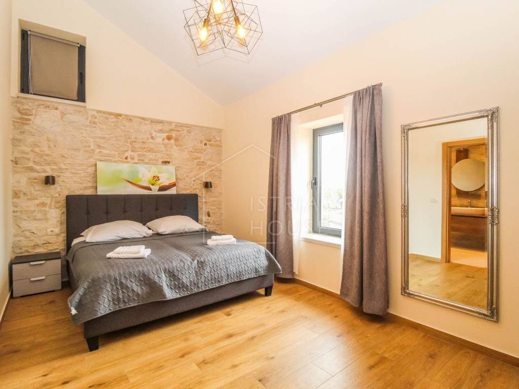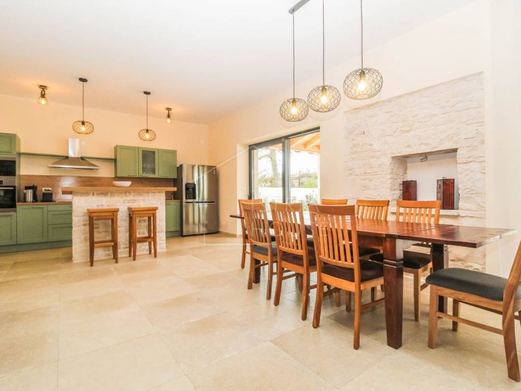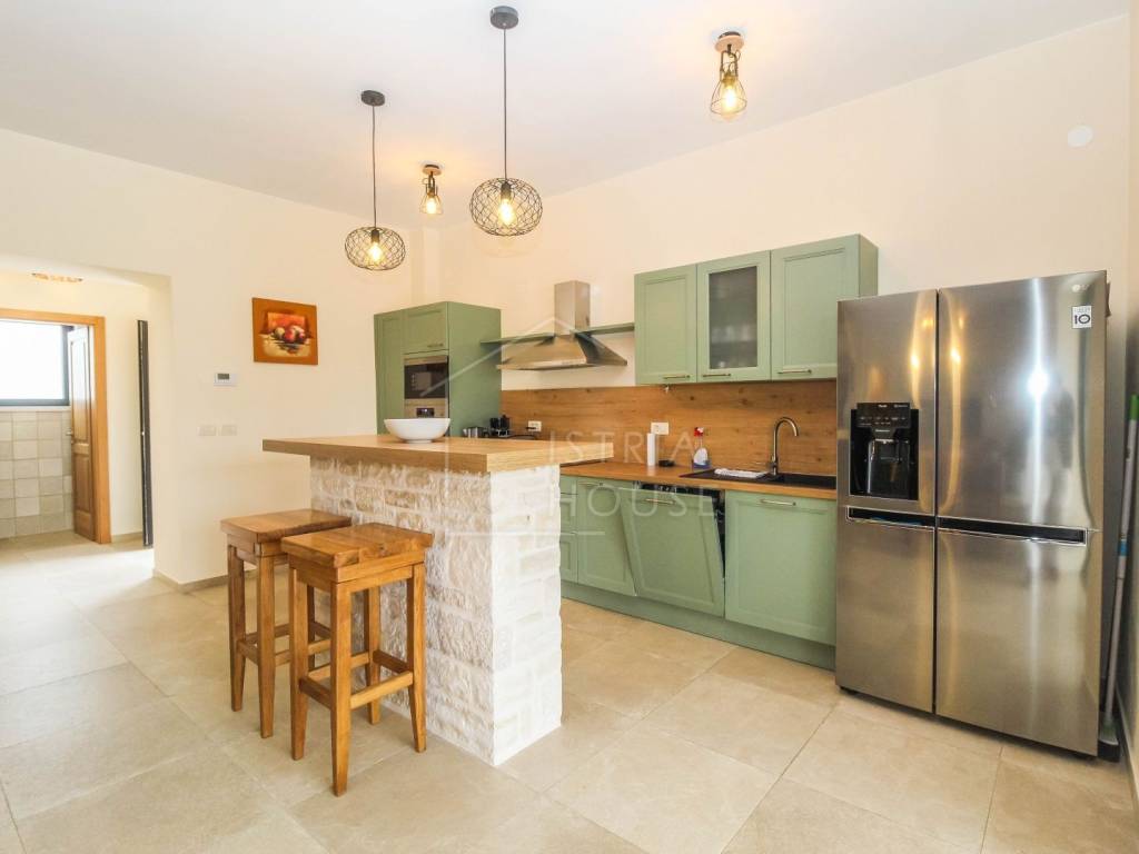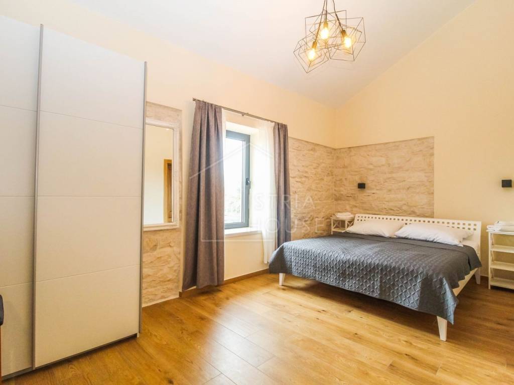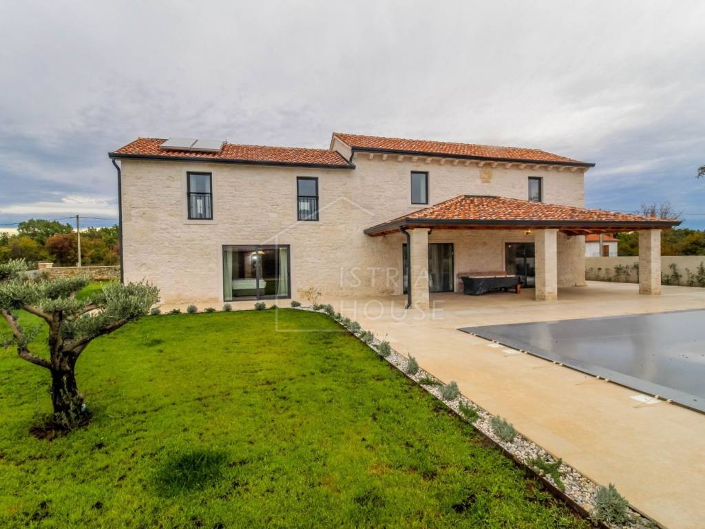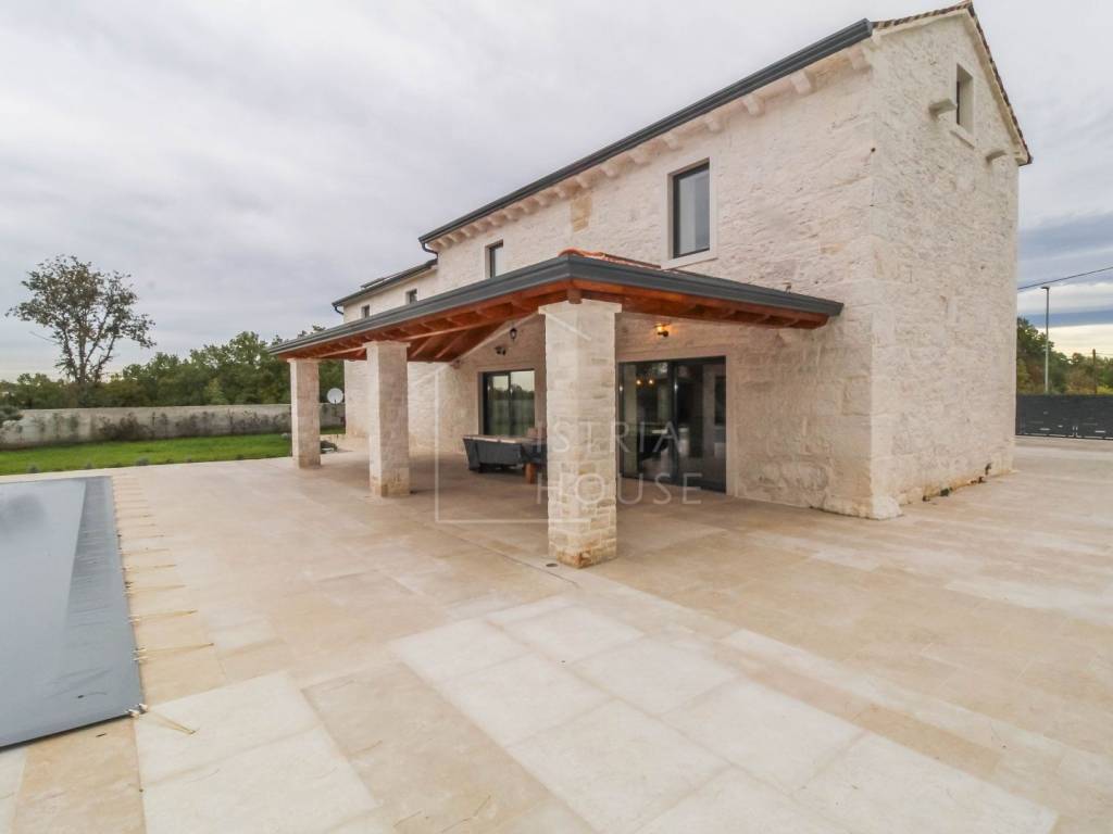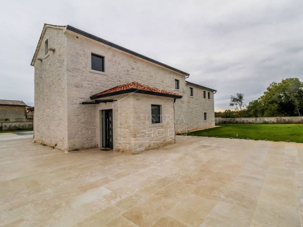 Prodaje se prostrana kamena autohtona kamena kuća u okolici Rovinja sa velikom okućnicom i bazenom. Kuća se nalazi na rubu manjeg mjesta u kojemu se nalazi sve potrebno za život. Nekretnina je autohtona i u potpunosti je renovirana i opremljena te je kao takva spremna za korištenje. U prizemlju kuće se nalazi prostrani open space dnevni boravak s kuhinjom i blagovaonicom iz kojih se izlazi na ogromnu natkrivenu tesasu. U prizemlju se također nalazi jedna spavaća soba s kupaonicom, jedan wc i ostava sa strojarnicom. Na katu kuće nalazimo 4 velike spavaće sobe, svaka sa svojim kupatilom te pogledom na dvorište i bazen. Kuća je opremljena morednim sustavom grijanja i hlađenja putem dizalice topline s fancoilerima te podnim grijanjem po cijeloj kući. Orijentacija nekretnina je također odlična jer je ona orijentirana prema jugozapadu. Na krovu su postavljeni i solarni paneli za grijanje sanitarne vode. U okućnici se nalazi vrhunski bazen i natkriveni dio sa ljetnom kuhinjom i roštiljem. Prekrasni Rovinj sa morem i plažama udaljen je samo 20 minuta vožnje autom.