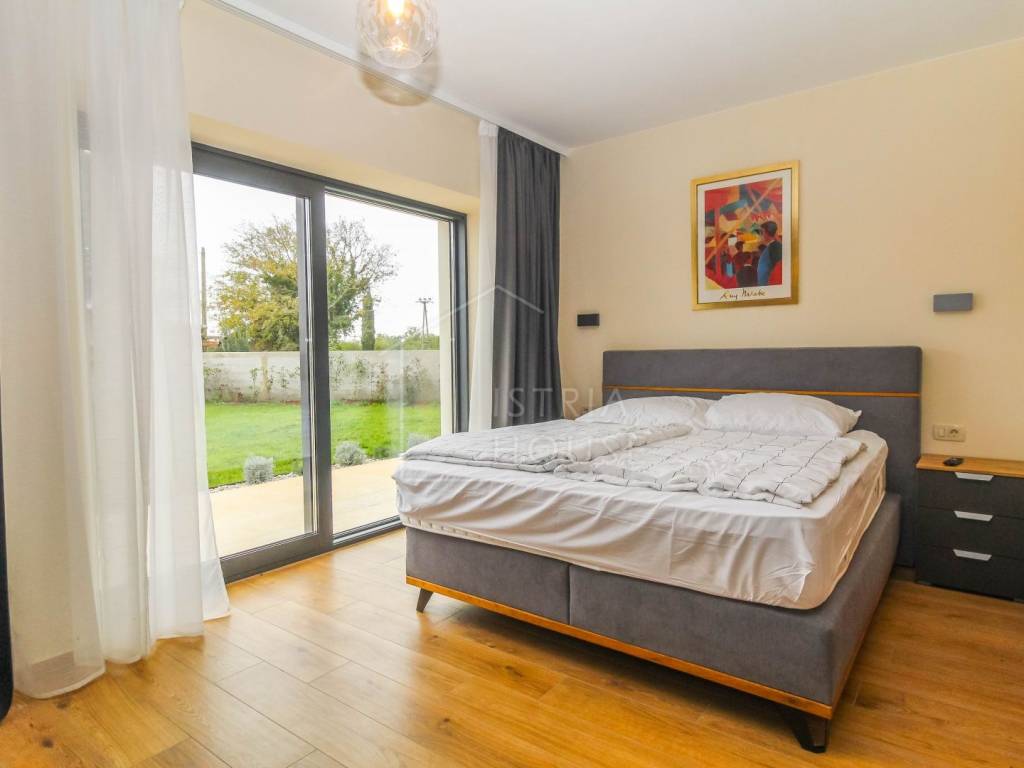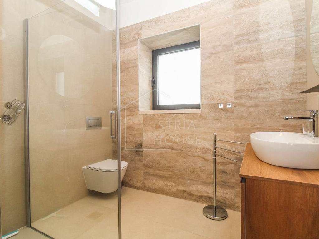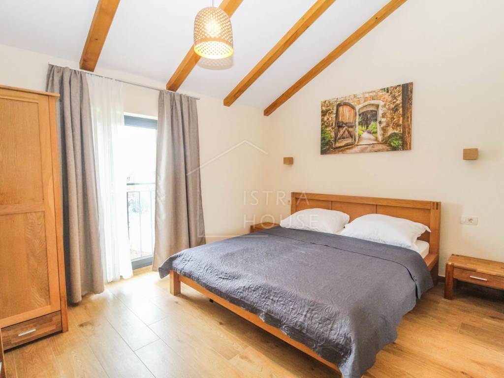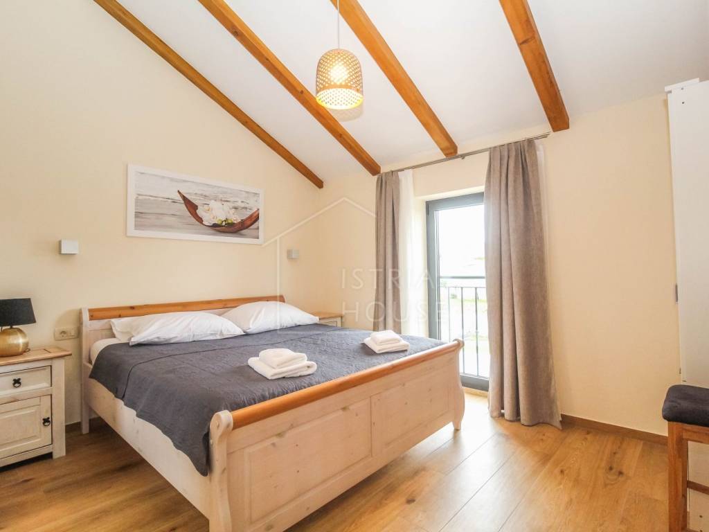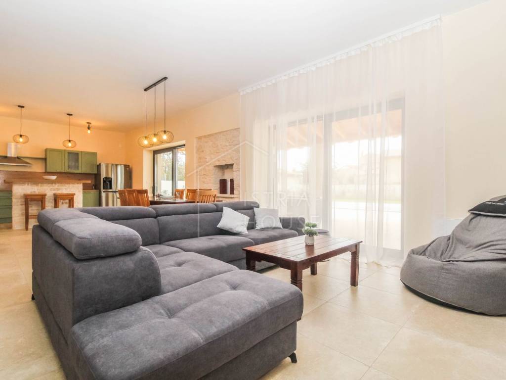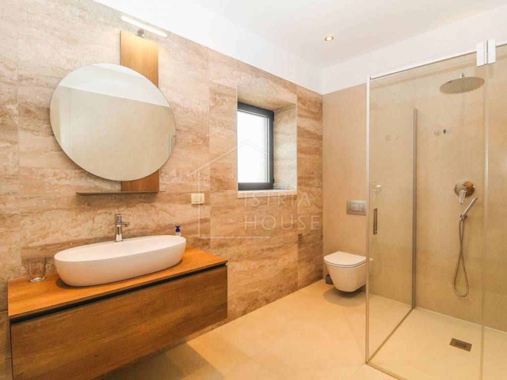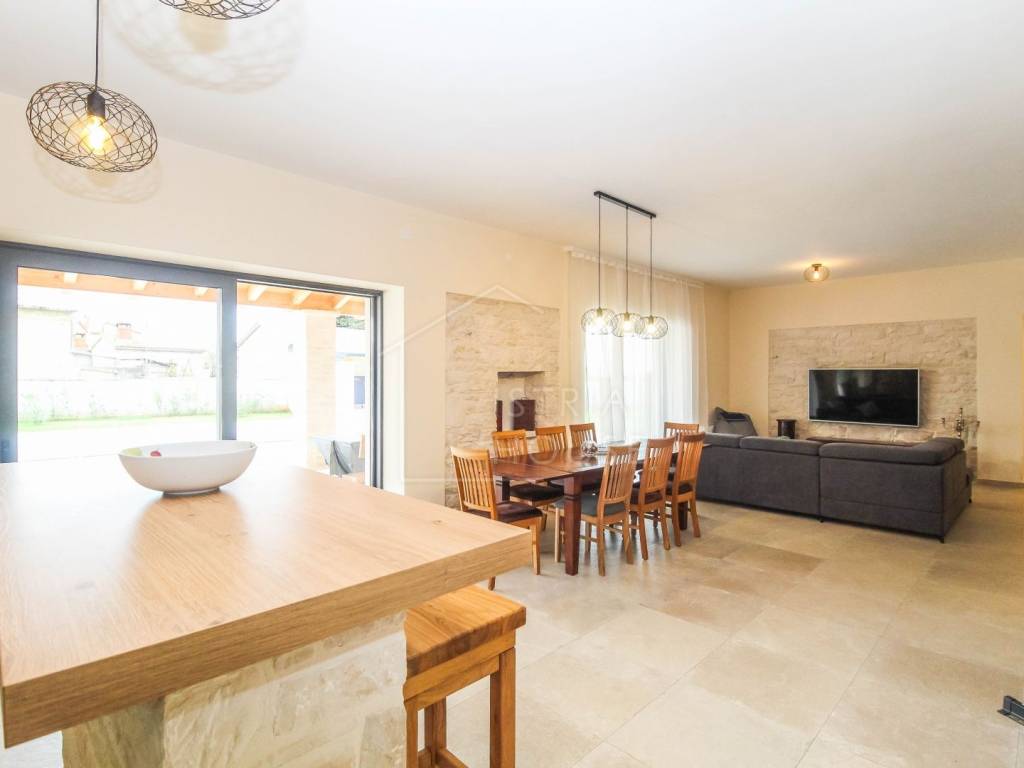 Prodaje se prostrana kamena autohtona kamena kuća u okolici Rovinja sa velikom okućnicom i bazenom. Kuća se nalazi na rubu manjeg mjesta u kojemu se nalazi sve potrebno za život. Nekretnina je autohtona i u potpunosti je renovirana i opremljena te je kao takva spremna za korištenje. U prizemlju kuće se nalazi prostrani open space dnevni boravak s kuhinjom i blagovaonicom iz kojih se izlazi na ogromnu natkrivenu tesasu. U prizemlju se također nalazi jedna spavaća soba s kupaonicom, jedan wc i ostava sa strojarnicom. Na katu kuće nalazimo 4 velike spavaće sobe, svaka sa svojim kupatilom te pogledom na dvorište i bazen. Kuća je opremljena morednim sustavom grijanja i hlađenja putem dizalice topline s fancoilerima te podnim grijanjem po cijeloj kući. Orijentacija nekretnina je također odlična jer je ona orijentirana prema jugozapadu. Na krovu su postavljeni i solarni paneli za grijanje sanitarne vode. U okućnici se nalazi vrhunski bazen i natkriveni dio sa ljetnom kuhinjom i roštiljem. Prekrasni Rovinj sa morem i plažama udaljen je samo 20 minuta vožnje autom.