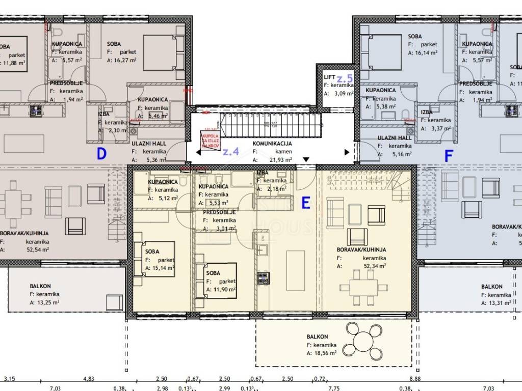 Stan se nalazi na prvom katu zgrade te se sastoji od 2 etaže. Na prvoj etaži su dnevni boravak, blagavaona i kuhinja kao jedan open space prostor, dvije spavaće sobe od kojih jedna ima kupaonicu , još jedna kupaonica te ostava. Iz dnevnog boravka biti će izlaz na balkon te unutarnjim stepenicama dolazi se do gornje etaže gdje su smještene još 2 spavaće sobe i jedna kupaonica. Tu je i izlaz na vanjsku krovnu terasu.