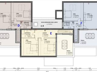 Na gornjoj etaži nalaze još dodatne dvije spvaće sobe te još jedna kupaonica. sa donje etaže iz dnevnog prostora se izlazi na balkon, a sa gornje na veliku terasu.