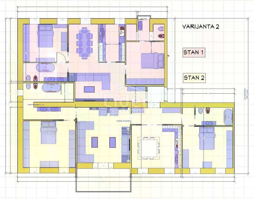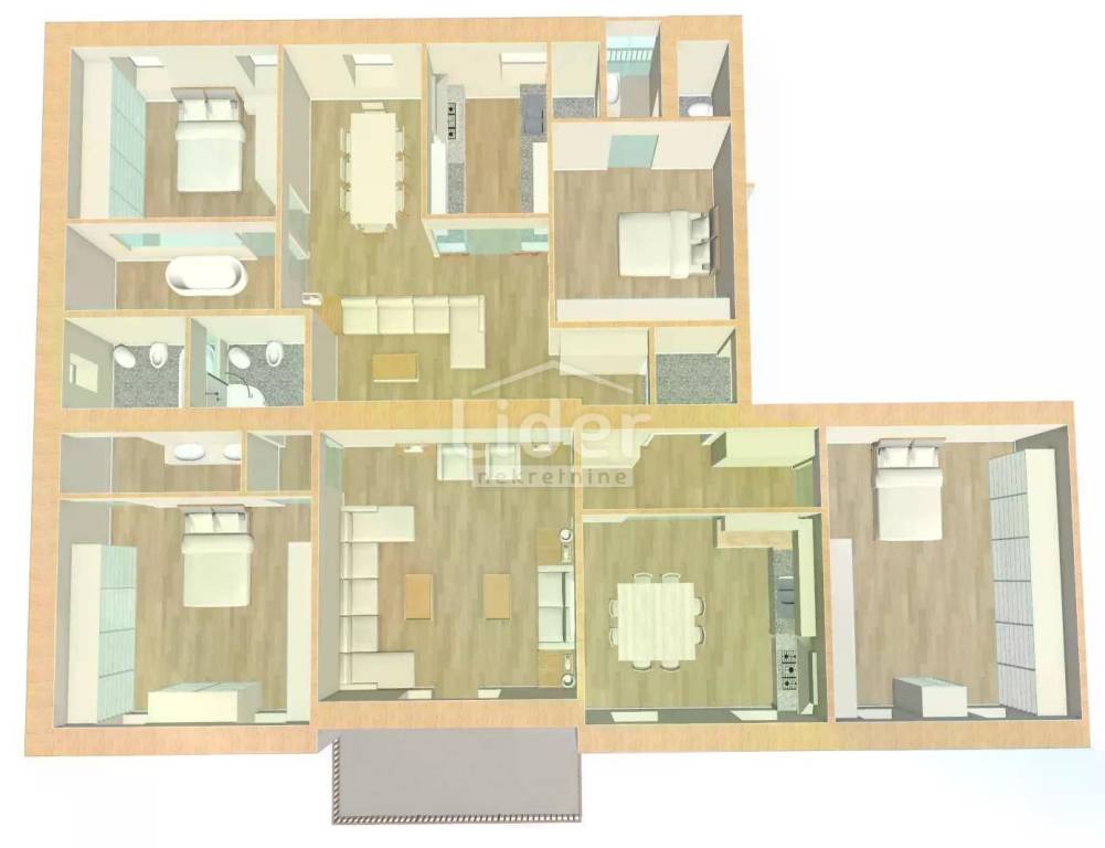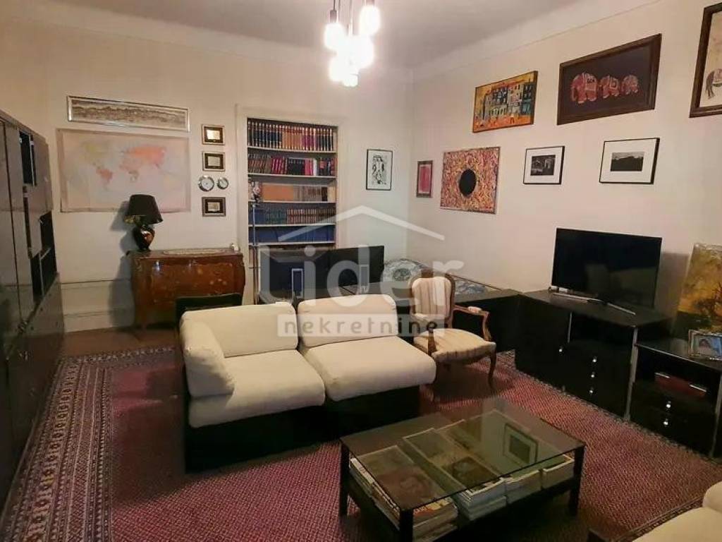 Izuzetno prostran stan koji se nalazi na Belvederu. Veličina stana je 205 m2 i uz građevinske preinake može se podijeliti u dvije stambene jedinice od 140 m2 i 65 m2. Sastoji se od ulaznog prostora od 14 m2, wc-a s prozorom, manjeg balkona, hodnika, kuhinje, ostave, blagovaonice, velikog salona s velikim balkonom i pogledom na park i more, tri velike spavaće sobe s pogledom na park i more, spavaće sobe prema sjeveru i kupaonice s prozorom. Stan je potrebno urediti. Uz stan je moguće dokupiti garažu za jedan automobil udaljenu 500 m od stana. Garaža ima priključak vode. Radi se o gospodskom stanu u neposrednoj blizini centra grada s panoramskim pogledom na cijeli Kvarner. Neposredna blizina svih sadržaja, škole, vrtića, fakulteta, ambulante, dućana i svega neophodnog za gospodski urbani život.