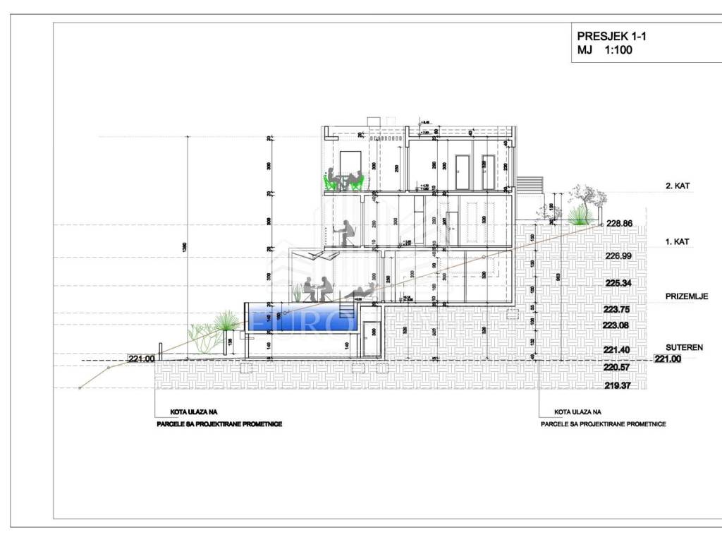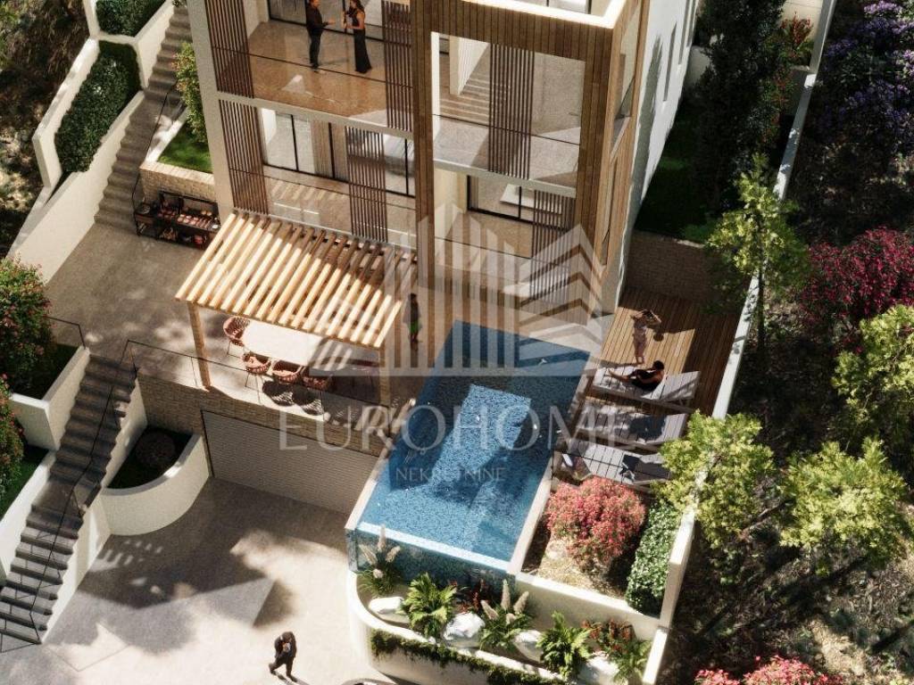 Površina zemljišta iznosi 449 m2. Projektirana vila ima ukupno 353,90 m2 stambene površine, raspoređene na četiri etaže, a uključuje i infinity bazen površine 26,47 m2.
