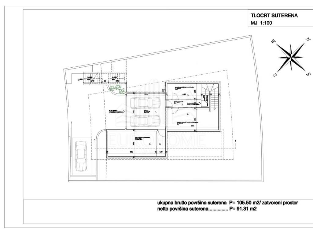 * Podrum (105,50 m2): garaža s dva parkirna mjesta, kotlovnica, spremište, praonica, sauna, tehnička prostorija za bazen i stubište prema prizemlju