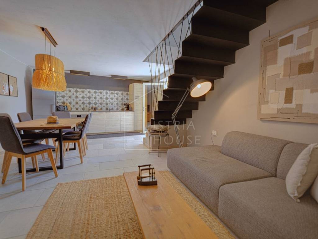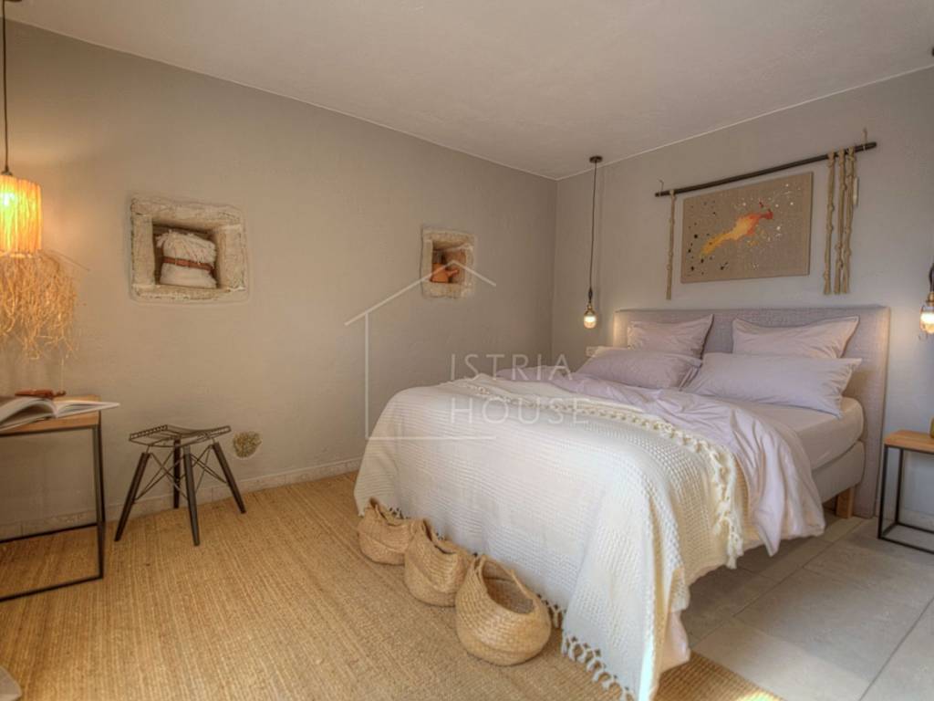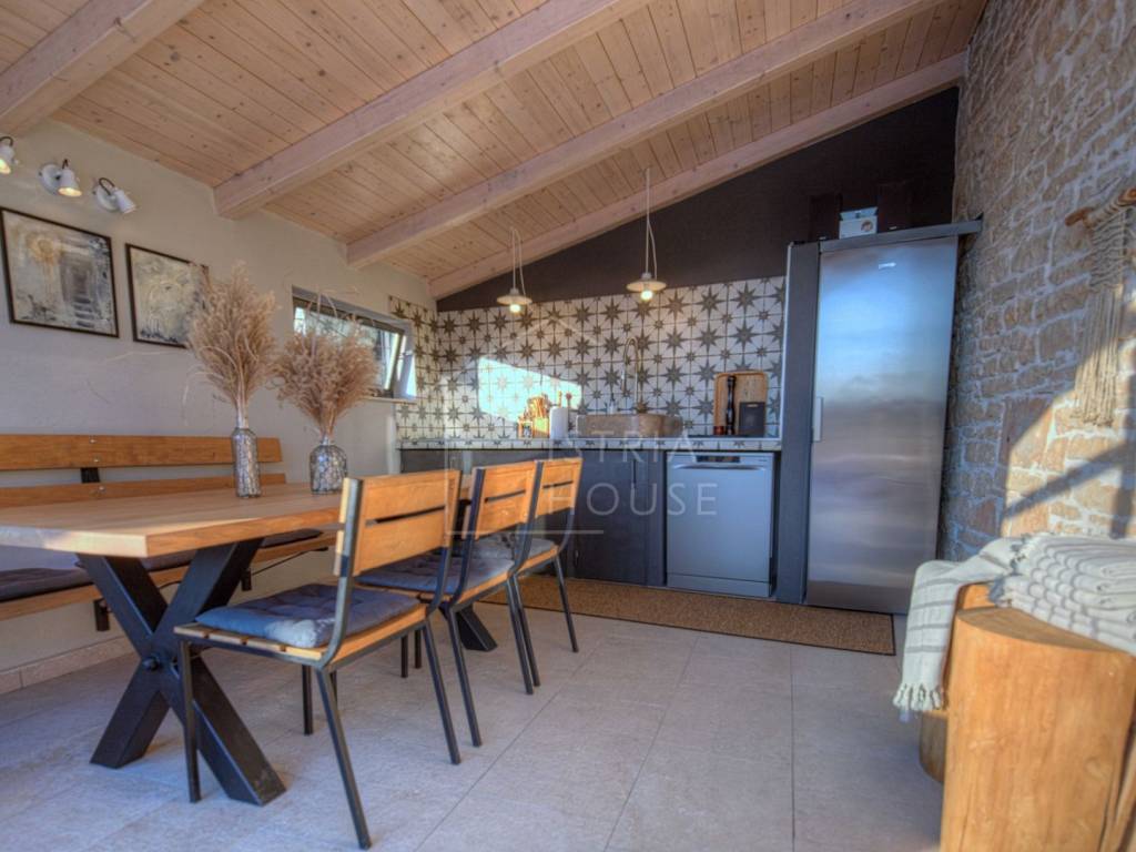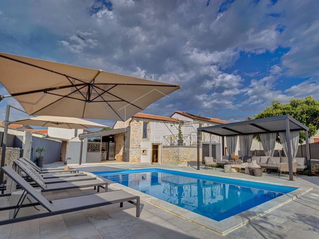 Prodaje se autohtona kamena kuća s bazenom uređena vrhunskim dizajnom koja se nalazi u okolici Kanfanara. Kuća ima 137 m2 a proteže se na dvije etaže. U prizemlju se nalazi otvorena kuhinja s dnevnim boravkom, spavaća soba s vlastitim kupatilom, vanski wc za goste, kotlovnica i prostrana ljetna kuhinja pokraj bazena. Na katu se nalaze dvije spavaće sobe također svaka sa svojim kupatilom te izlazom na otkrivenu terasu s koje se pruža otvoreni pogled, a u daljini se nadzire i more. U odlično uređenoj i potpuno ograđenoj okućnici nalazi se bazen sa brojnim mediteranskim elementima i biljkama. Kuća je opremljena klima uređajima, podnim grijanjem u kupatilima, solarnim panelima za grijanje vode te grijani bazen. U dvorište se nalazi i parkiralište za dva auta.