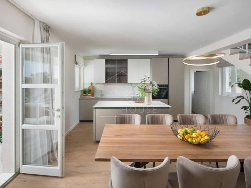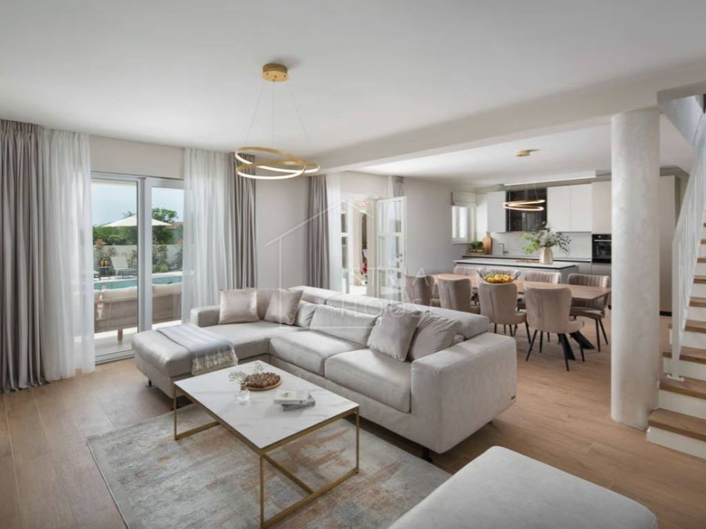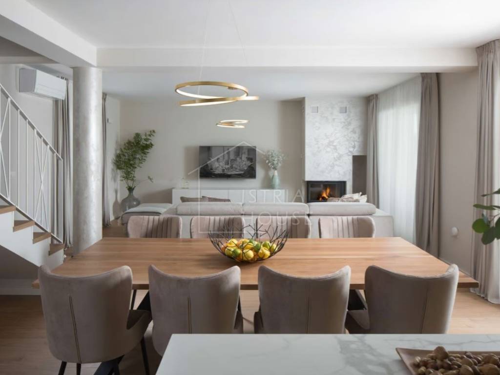 Vila ujedinjuje tradicionalni i moderni stil te je građena i opremljena vrhunskim i kvalitetnim materijalima što je vidljivo po opremljenosti i po dizajnu kuće.Prodaje se namještena.