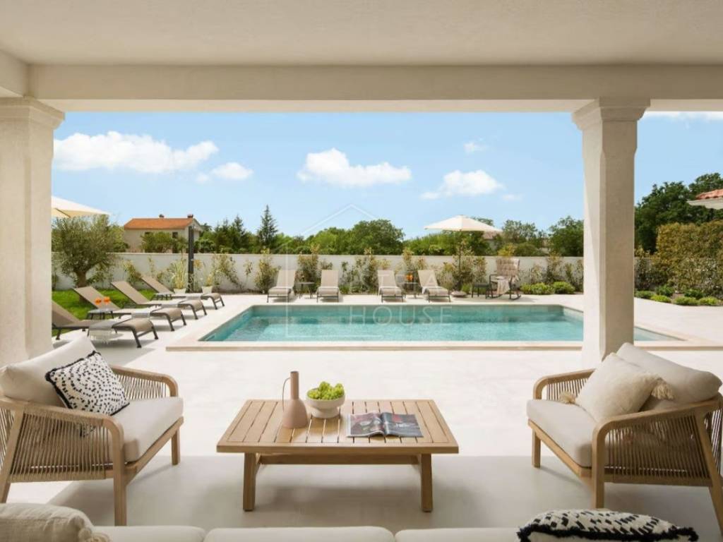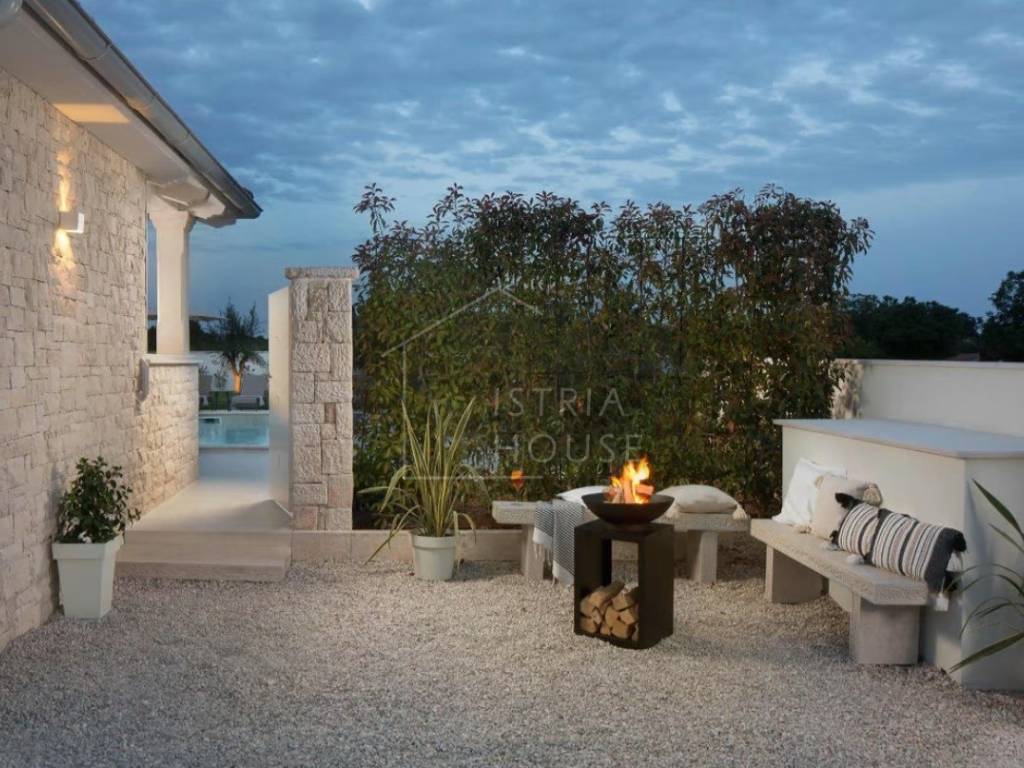 Vanjskim dijelom kompletno ograđene okućnice dominira veliki bazen sa svojim sunčalištem do kojeg je natkrivena terasa sa velikim blagovaonskim stolom te opremljenom ljetnom kuhinjom.