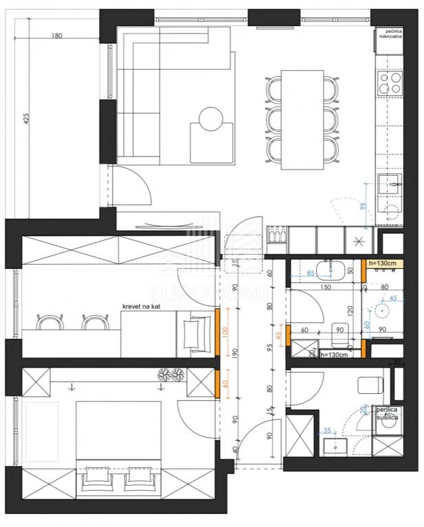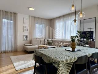 Stan ima otvoreni koncept dnevnog boravka, blagovaonice i kuhinje, koji nudi osjećaj prostranosti i suvremenog načina života.