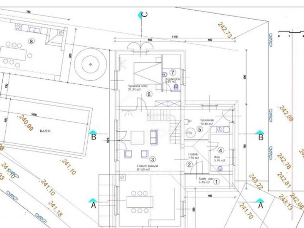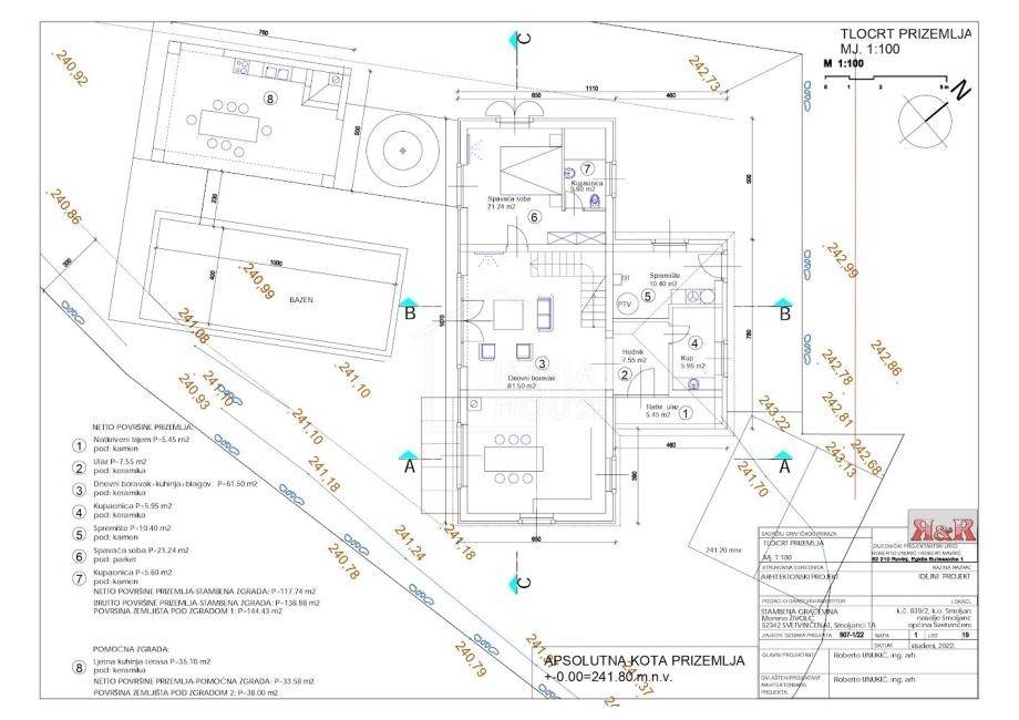 Prodaje se moderna kuća sa bazenom, okrenuta prema jugozapadu, na idiličnoj lokaciji na rubu sela i urbanizacije. Planirani početak gradnje je u 2024. godini, što ovu nekretninu čini savršenim odabirom za one koji žele sudjelovati u kreiranju svog budućeg doma. U prizemlju se nalazi prostrani dnevni boravak s otvorenom kuhinjom i blagovaonicom, jedna spavaća soba s kupaonicom, toalet, kotlovnica i pomoćni objekt. Na katu su smještene dvije spavaće sobe, svaka sa svojom kupaonicom, nudeći privatnost i udobnost.