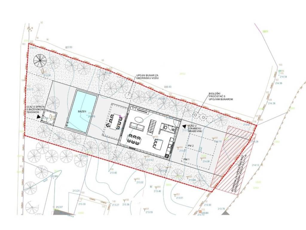 Na vanjskom dijelu okućnice uz bazen tu je predviđeno spremište sa bazenskom tehnikom, biološki pročistač, te 2 parkirna mjesta.