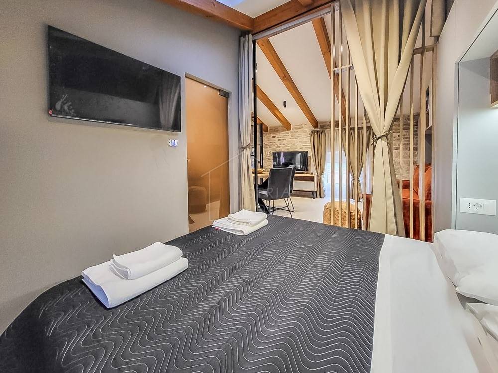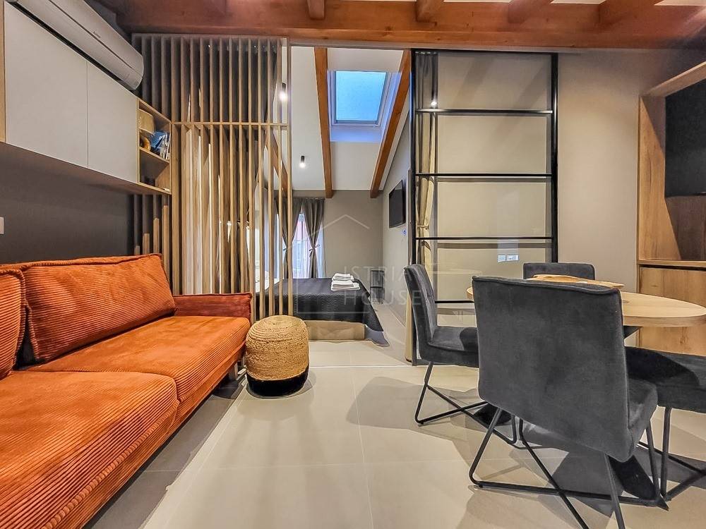 Središnji dio stana čini prostrana spavaća soba odvojena zavjesama, stvarajući intimnost i miran kutak za odmor. Krevet je okružen drvenim elementima i diskretnim rasvjetnim tijelima, stvarajući opuštajuću atmosferu. Dnevni boravak je suvremeno opremljen i povezan s kuhinjom, koja je kompaktna, ali potpuno funkcionalna, savršena za pripremu obroka.