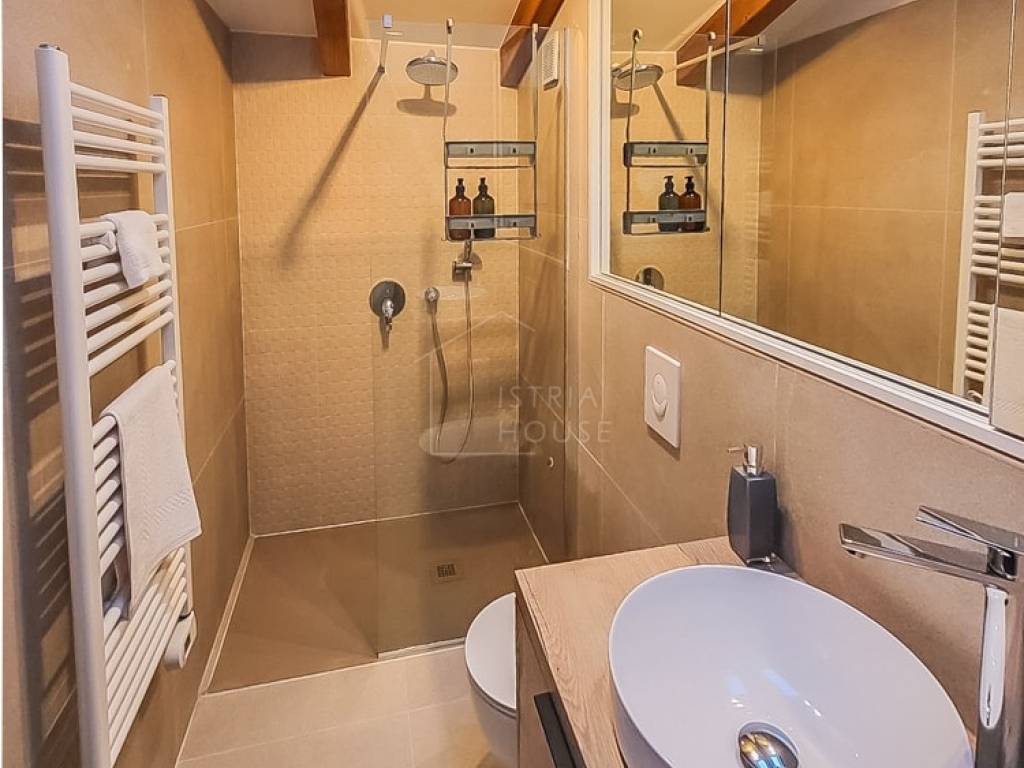 Kupaonica je moderna i elegantna, s čistim linijama i pažljivo biranim detaljima, što dodatno doprinosi luksuznom osjećaju prostora. Veliki prozori i staklene stijene omogućavaju puno prirodnog svjetla, dok krovni prozori unose dodatnu toplinu u prostor.