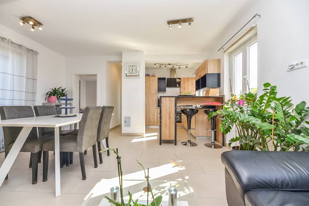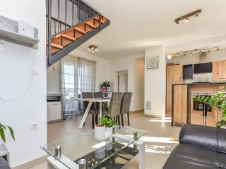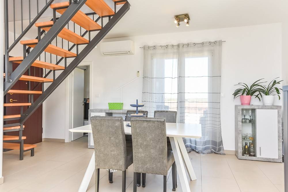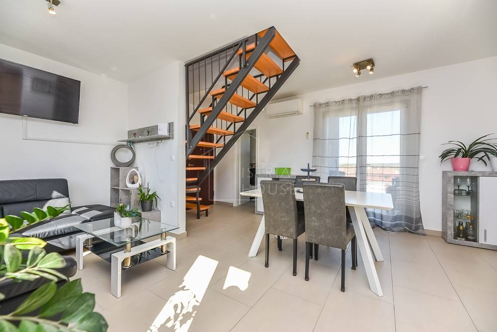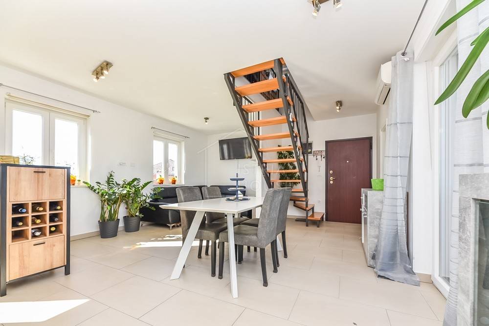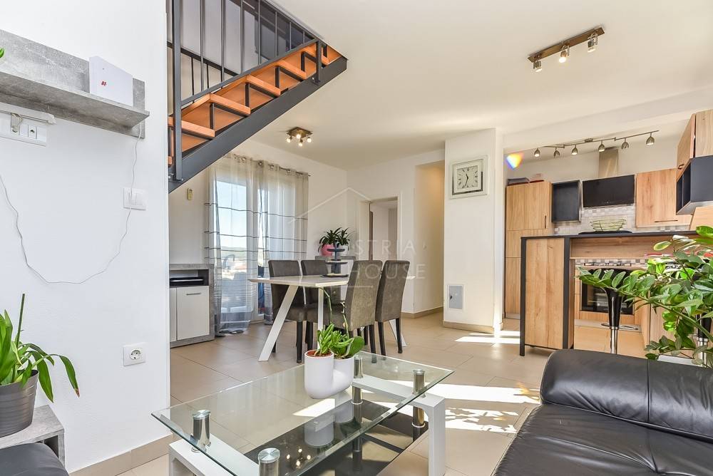 U donjoj etaži nalazi se prostrani open-space dnevni boravak s blagovaonicom i moderno opremljenom kuhinjom, dvije spavaće sobe te kupaonica. Na gornjoj etaži smještena je treća spavaća soba i još jedna kupaonica, što ovaj stan čini savršenim za obitelj ili kao investiciju za turistički najam.