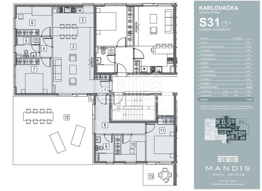 Na prodaju je luksuzan petosoban stan površine 119,80 m², smješten na 3. katu moderne novogradnje u Zagrebu, naselje Blato.