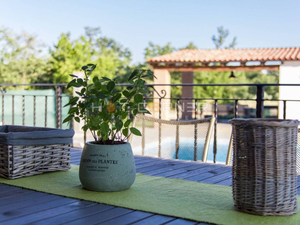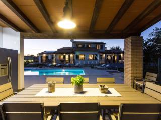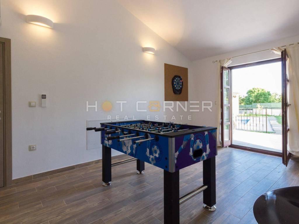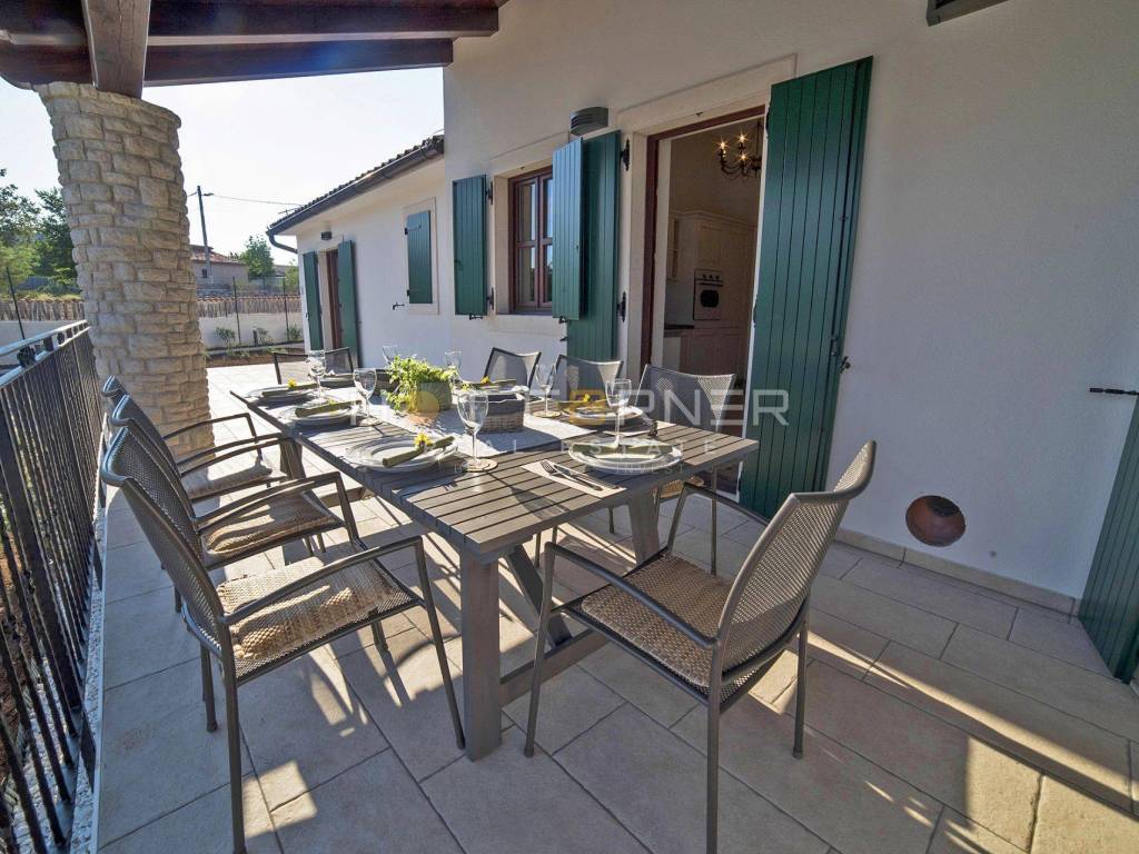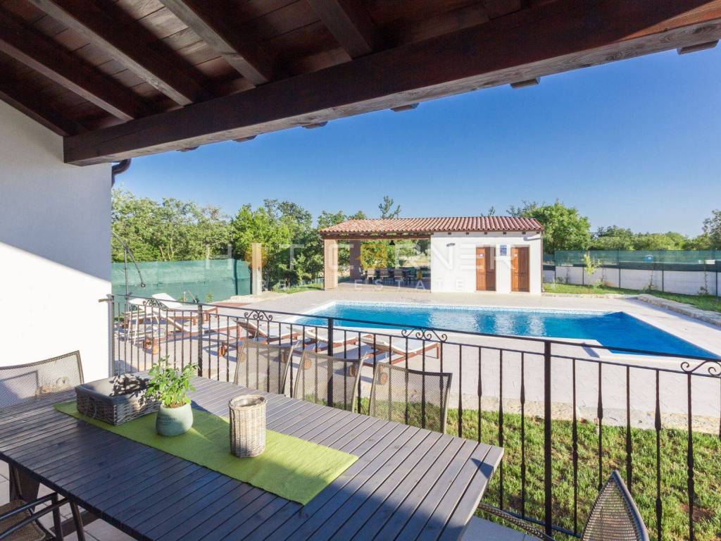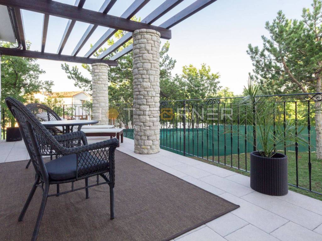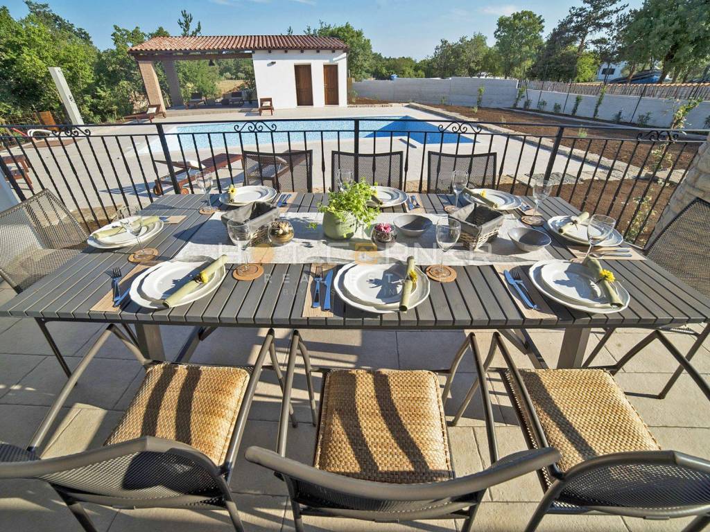 Terasa iz kuhinje i dnevnog boravka vodi na natkrivenu terasu , a u nastavku na već spomenutu prostranu okućnicu gdje se nalazi i bazen 10m x 5m, ljetna kuhinja, roštilj, laundry room te wc.