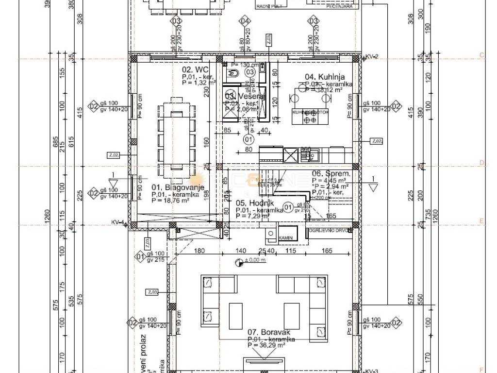 - u prizemlju : ulazni hodnik, verešaj, wc, spremište ( za kotlovnicu ), kuhinju, blagovaonicu, prostrani dnevni boravak te dvije natkrivene terase. Jednu sa prednje strane kuće koja vodi na bazen i drugu sa stražnje strane kuće gdje je predviđen roštilj.