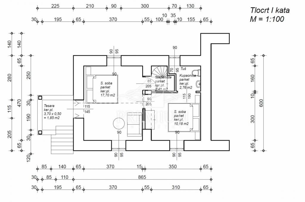 1. kat – dvije sobe (trenutno jedna soba, ovisno o želji kupca), kupaonica i terasa.