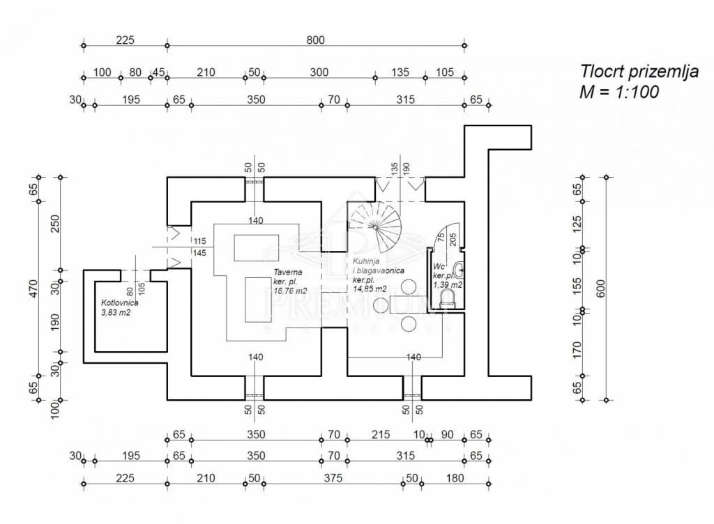 Prizemlje – kuhinja, dnevni boravak (taverna) i toalet.