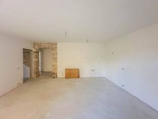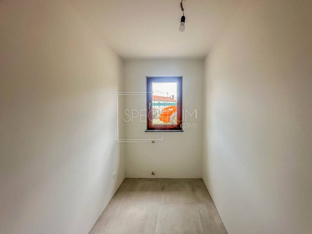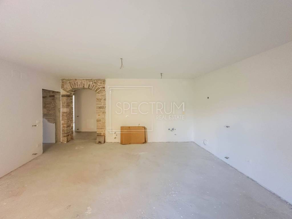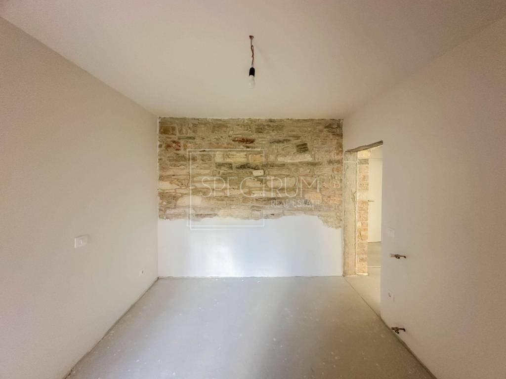 Stan se nalazi u prizemlju nedavno renovirane stambene zgrade. Površina stana iznosi 79.95 m2. Stan se sastoji od open space dnevnog boravka sa kuhinjom i blagovaonicom, 2 spavaće sobe, dodatne sobe koja može poslužiti kao još jedna spavaća soba ili radna soba, kupaonice, hodnika, ostave i loggie. Pored loggie se nalazi još jedna natkrivena terasa te vrt površine 32.49 m2. Stan se grije putem klima uređaja, postoji mogućnost i ugradnje peći na drva ili pelete, a napravljena je i priprema za centralno grijanje. Stan je renoviran kvalitetnim materijalima, kombinirajući moderne elemente sa tradicionalnim elementima, poput kamenih zidova. Stan ima i vlastito parkirno mjesto koje se nalazi odmah pored ulaza u samu zgradu.