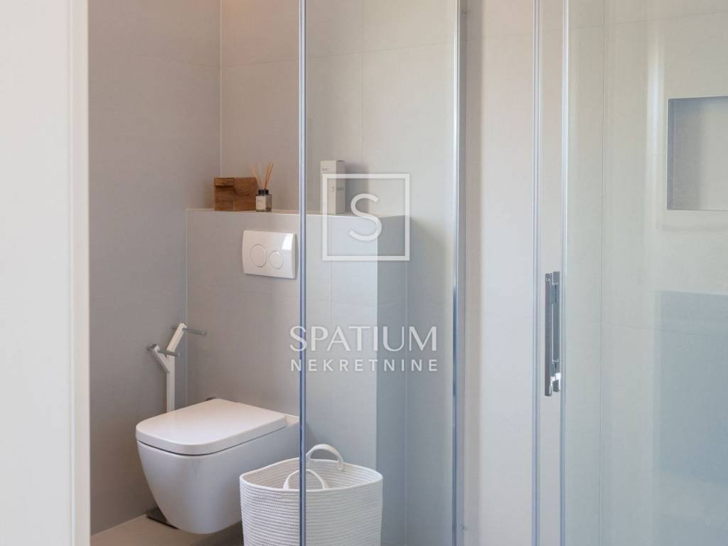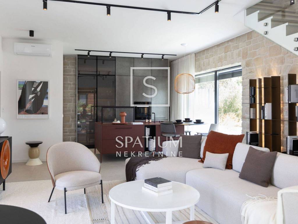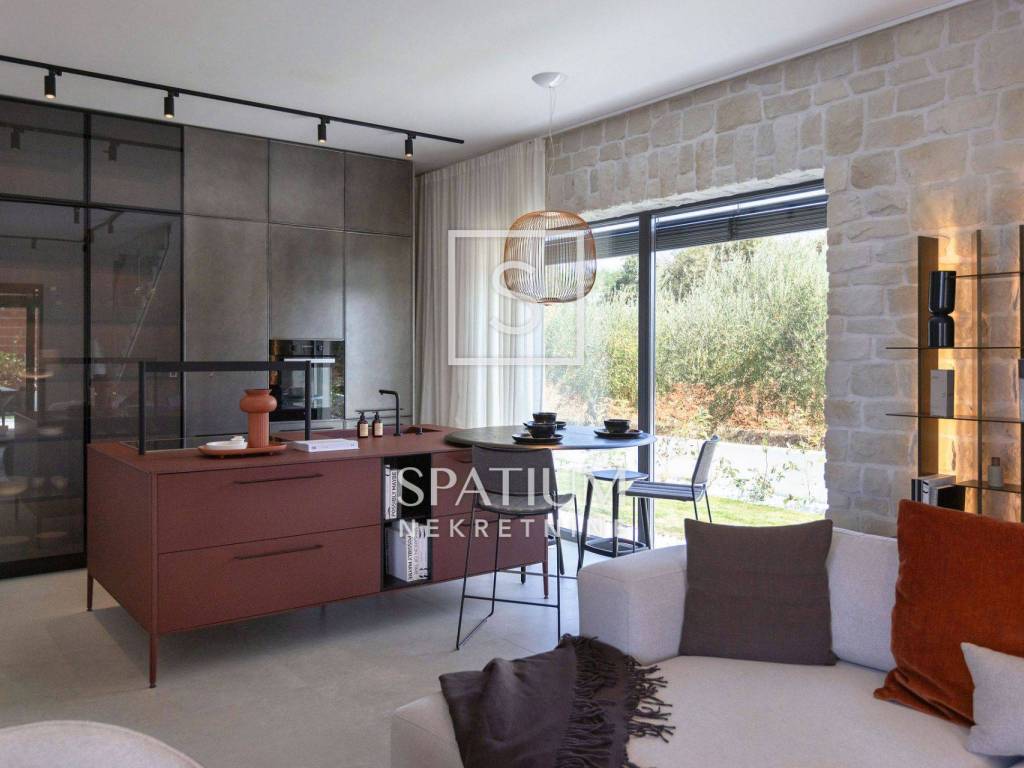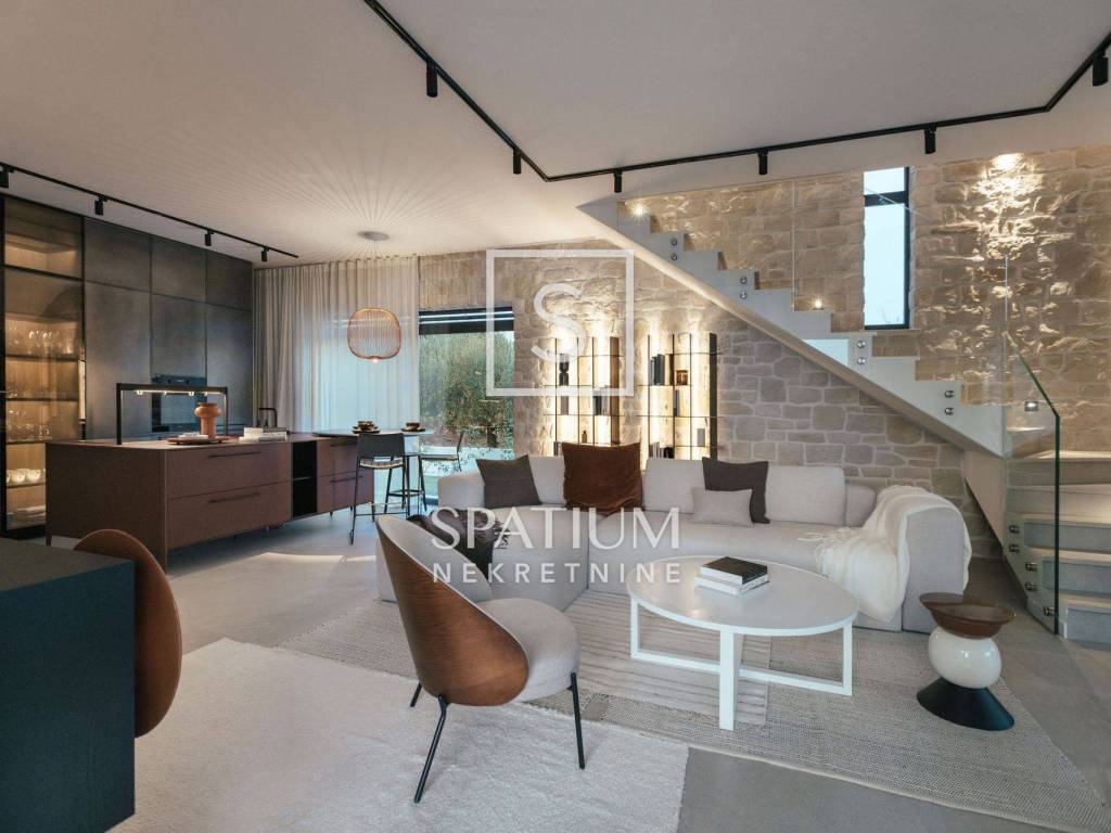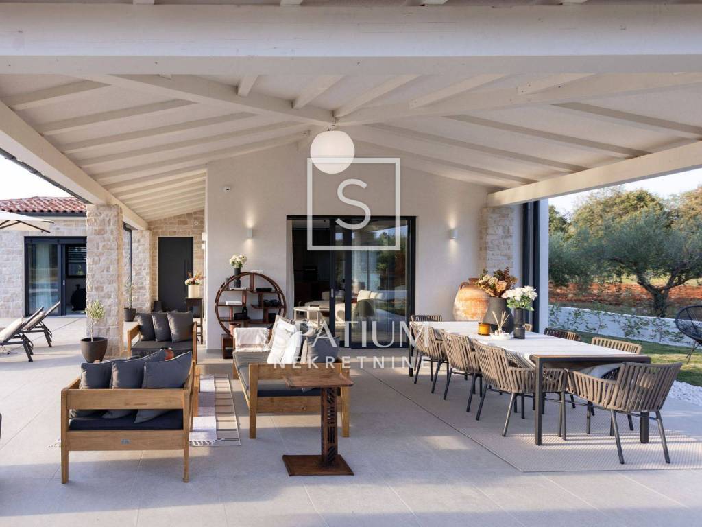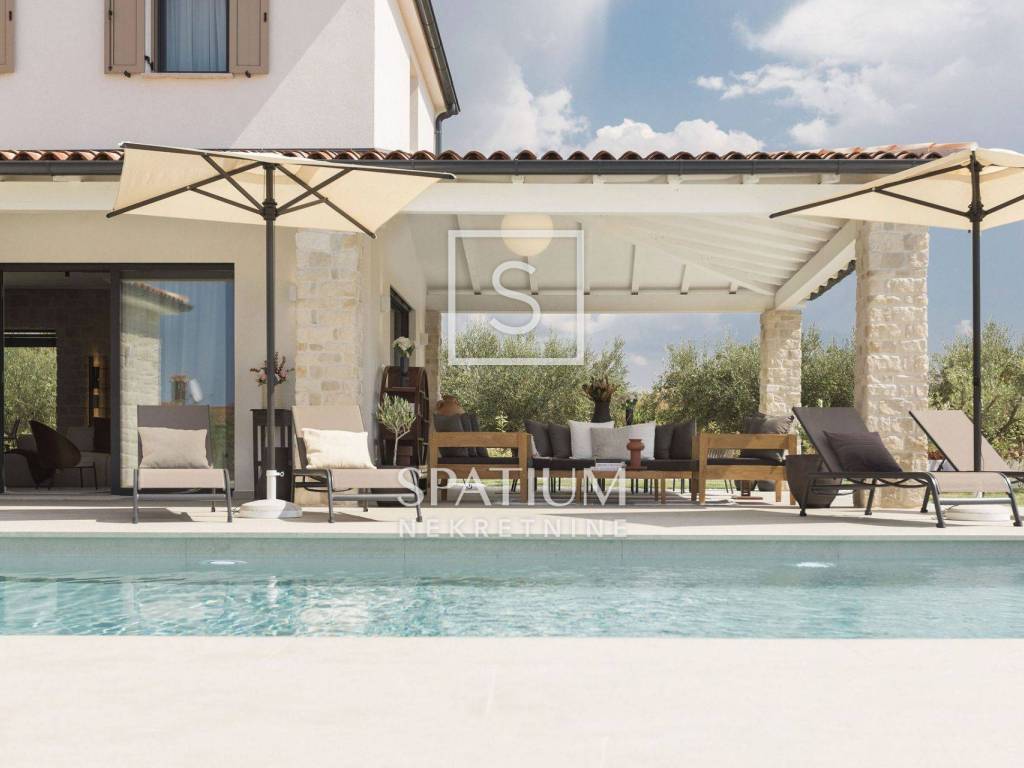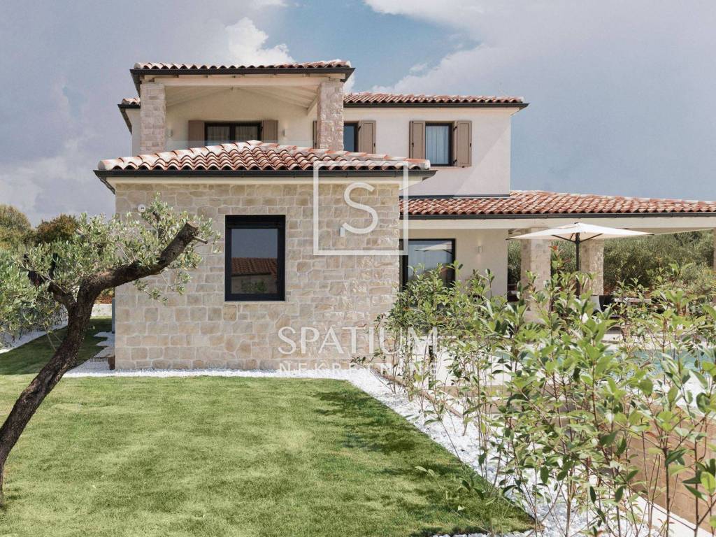 POREČ, u ponudu smo dobili ovu prekrasnu kamenu vilu, smještenu u blizini Poreča na samo desetak minuta vožnje od mora. Vila se sastoji od "open space" kuhinje s blagovaonicom i dnevnim boravkom, tri spavaće sobe, tri kupaonice i jedan WC za goste. Natkrivena i nenatkrivena terasa za "al fresco" objedovanje, grijani bazen od 41m2 te mediteranski vrt upotpunjuju okućnicu ove prekrasne kamene vile. Na katu se nalazi još jedna terase sa koje se pruža pogled na more. Grijanje i hlađenje izvedeno je dizalicom topline i podnim grijanjem. Prilikom gradnje korišteni su samo materijali vrhunske kvalitete (talijanska kuhinja i keramika, ALU stolarija, LED rasvjeta...). Prodaje se kompletno namještena.