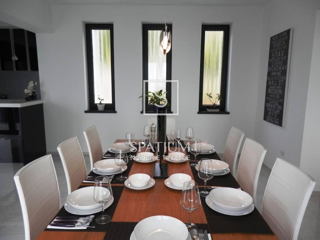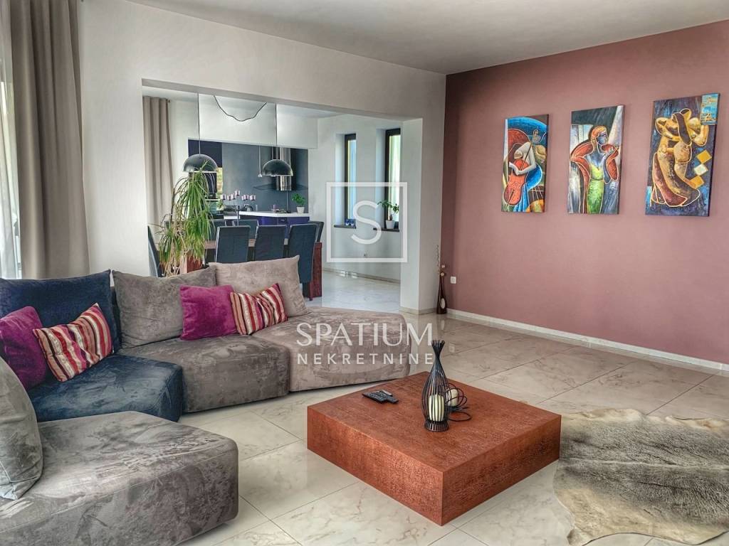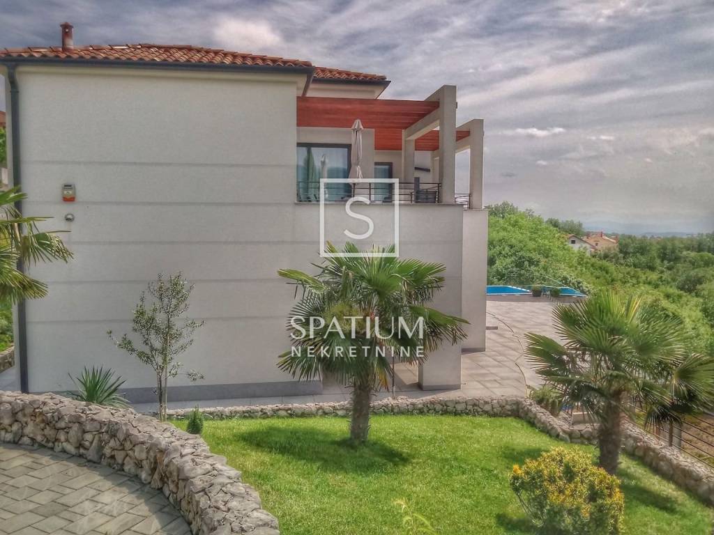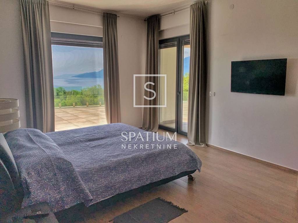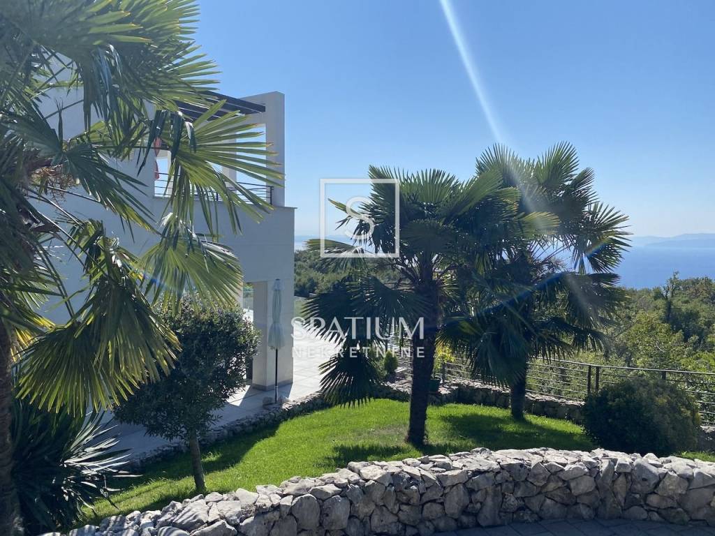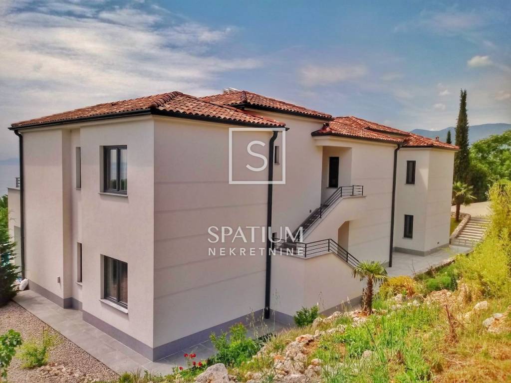 KASTAV, u ponudu smo dobili ekskluzivnu vilu s bazenom i panoramskim pogledom na more. Vila se smjestila na samo petnaestak minuta vožnje od centra Opatije, te isto toliko i od samog centra Rijeke. Nekretnina se proteže na više od 300 m2 prekrasno uređenog interijera podijeljenog u dva stana s posebnim ulazima. Na okućnici se nalazi bazen od 32 m2 sa sunčalištem okružen prekrasnim mediteranskim vrtom. Prilikom izgradnje i opremanja vile, korišteni su samo vrhunski materijali i oprema. Grijanje i hlađenje osigurano je dizalicom topline i podnim grijanjem. Nekretnina ima kompletan video nadzor kako bi osigurala privatnost i sigurnost budućim vlasnicima. Oba stana imaju po tri spavaće sobe, dvije kupaonice, WC za goste kao i open space kuhinju s blagovaonicom i dnevnim boravkom.
