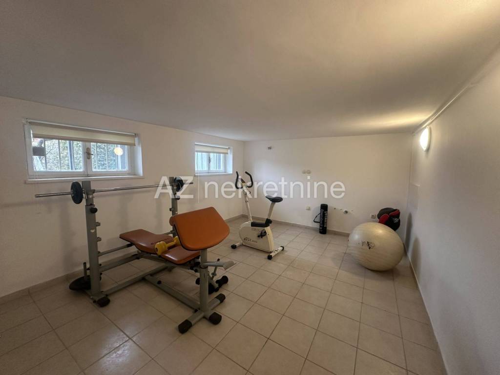 U dvorištu koje je opločeno ima dovoljno parkinga, veličina garaže je 21m2, a uz garažu nalazi se i spremište. Kuća se može iznajmiti namještena i nenamještena, ovisno o potrebi najmoprimaca.