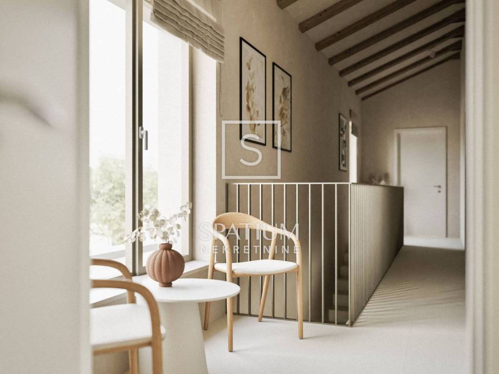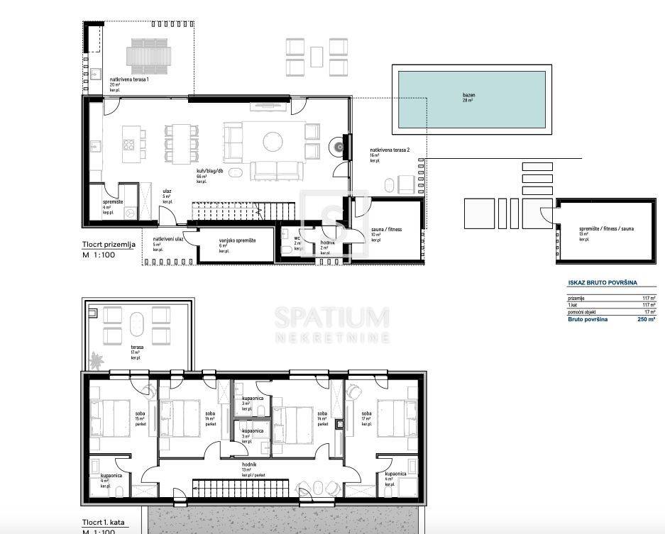LABIN, u ponudu smo dobili vrhunsku novogradnju u mirnoj okolici Labina. Nekretnina se nalazi na zemljištu od 2748m2 od kojih će 1439m2 biti zelena površina. Kuća se sastoji od prizemlja i kata s ukupno 197m2 interijera. U prizemlju se nalazi veliki "open space" koncept dnevnog boravka, kuhinje i blagovaonice (66m2) iz kojeg se izlazi na čak dvije natkrivene terase od kojih jedna ima bazen od 47m2 sa sunčalištem te dodatnim objektom u kojem se smjestila sauna, gym i dodatno spremište. Na okućnici uređenoj i ukrašenoj mediteranskim biljem nalaze se i tri natkrivena parkirna mjesta. Unutarnjim stepeništem dolazi se na kat gdje se nalaze četiri spavaće sobe svaka od njih sa vlastitom kupaonicom. Prilikom gradnje, svi ugrađeni materijali kao i oprema (podno grijanje, klimatizacija, stolarija) su vrhunske kvalitete. Nekretnina se prodaje po sistemu ključ kompletno namještena. Završetak gradnje je očekivan početkom 2026. godine.