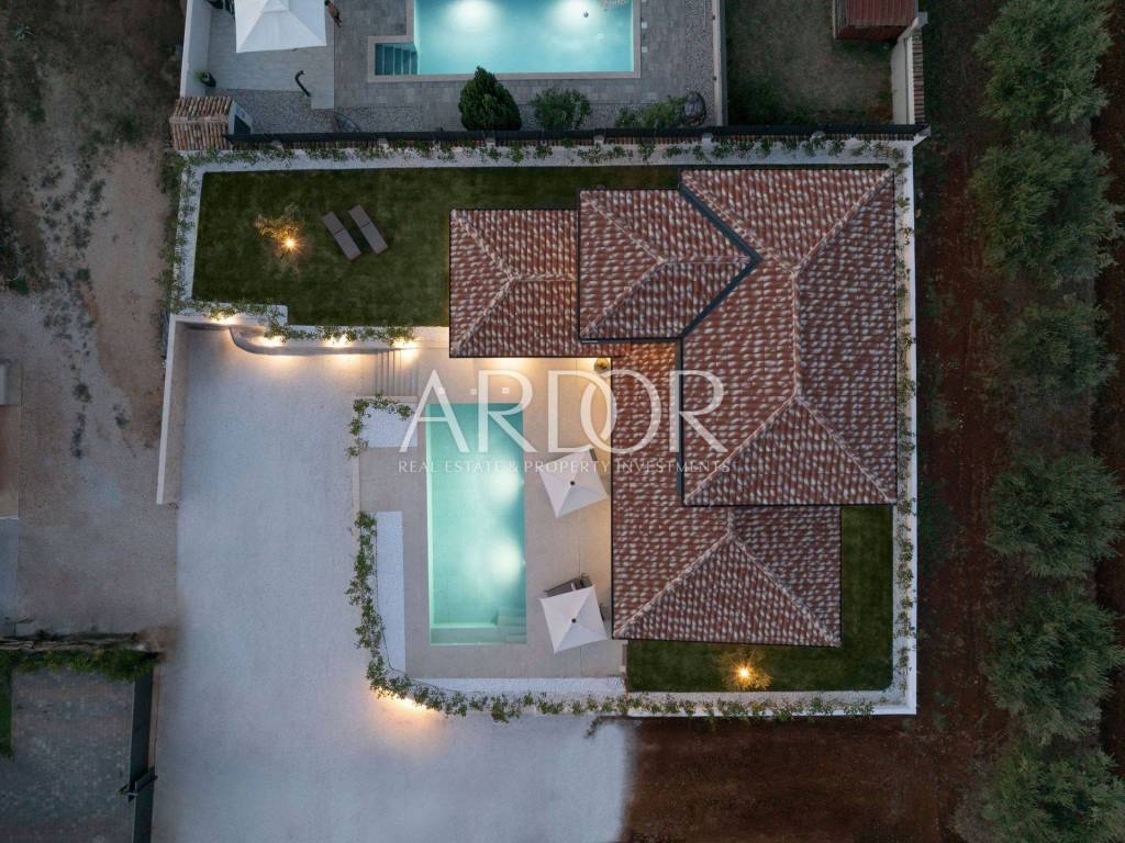 Vanjski prostor mami s nekoliko natkrivenih i nenatkrivenih terasa, idealnih za objedovanje pod vedrim nebom, grijanim bazenom od 40 m2 i mediteranskim vrtom.