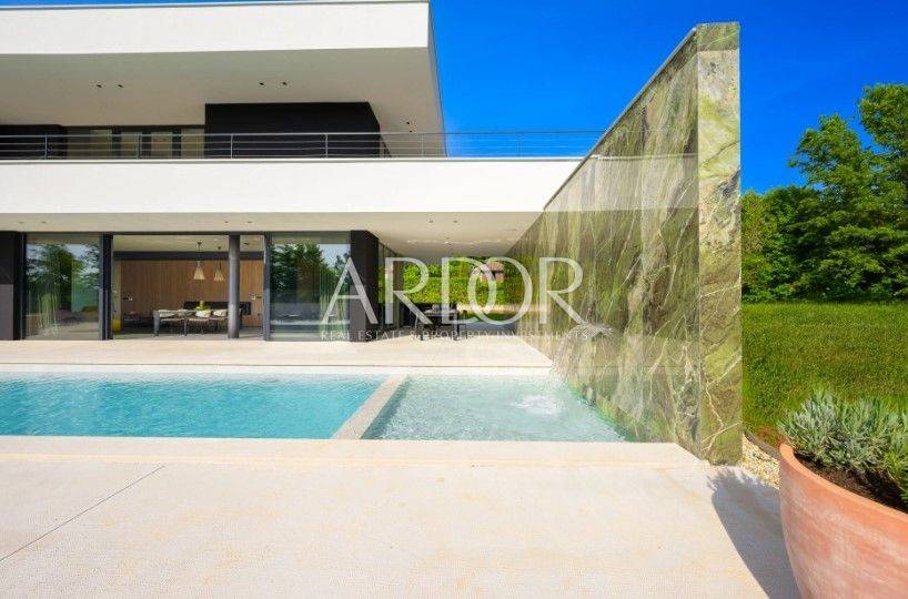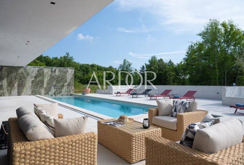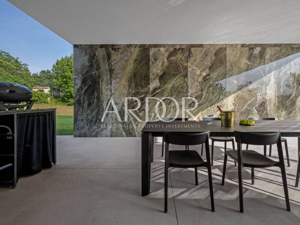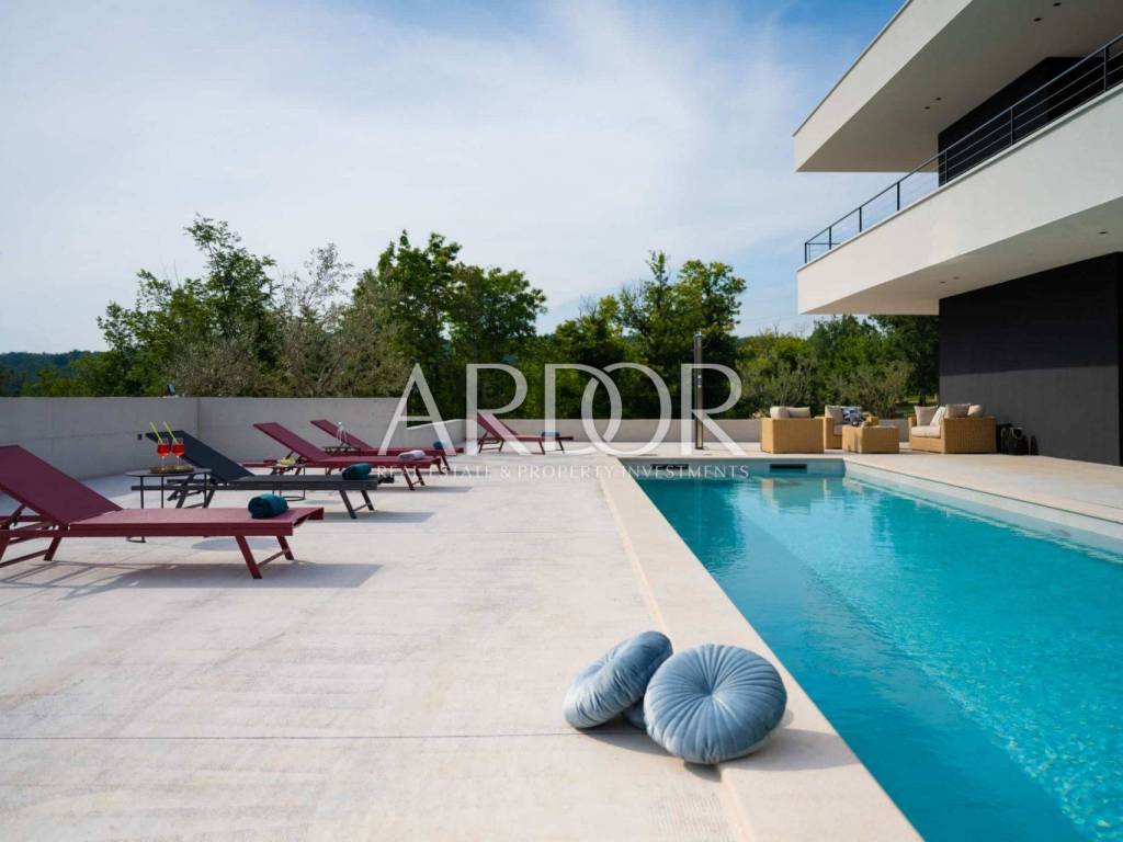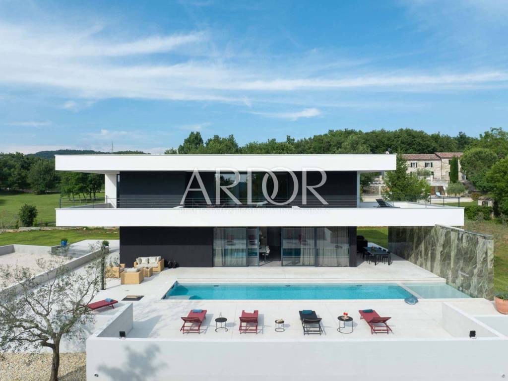 Smještena na mirnoj i slikovitoj lokaciji u blizini Grožnjana, elegantna dizajnerska vila nudi jedinstvenu priliku za život u srcu Istre. Na prostranoj čestici od 2.170 m², okružena prirodom i zelenilom, vila pruža panoramske poglede sa svih strana, stvarajući savršeno mjesto za opuštanje i uživanje u privatnosti.