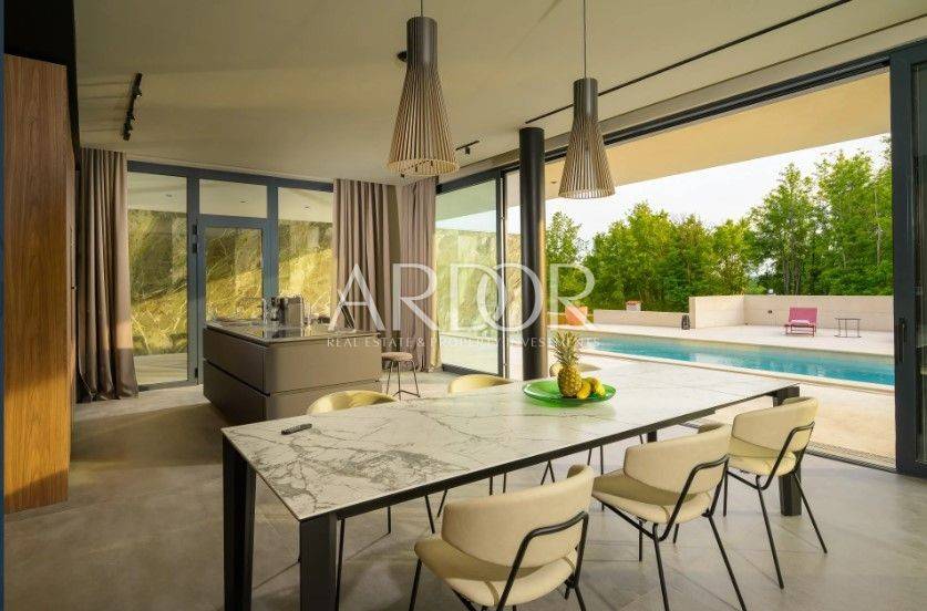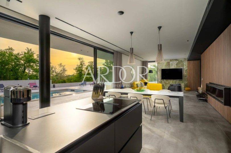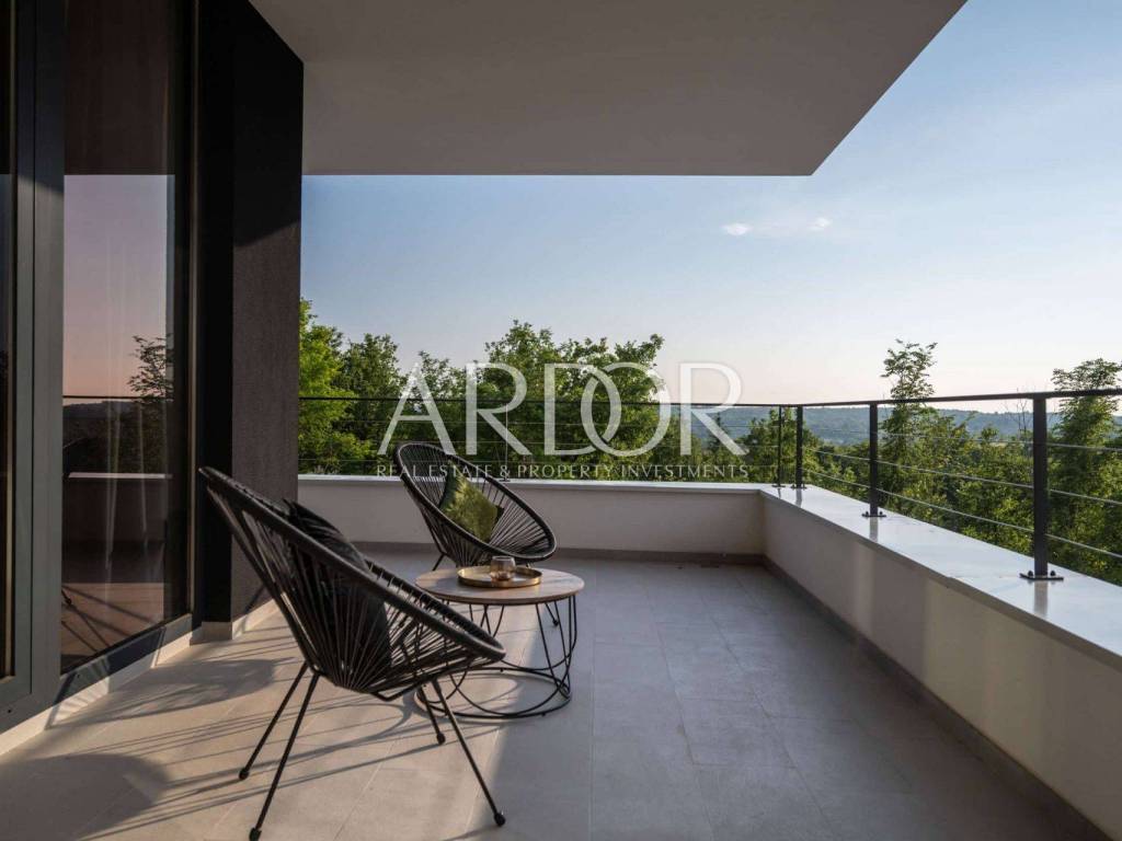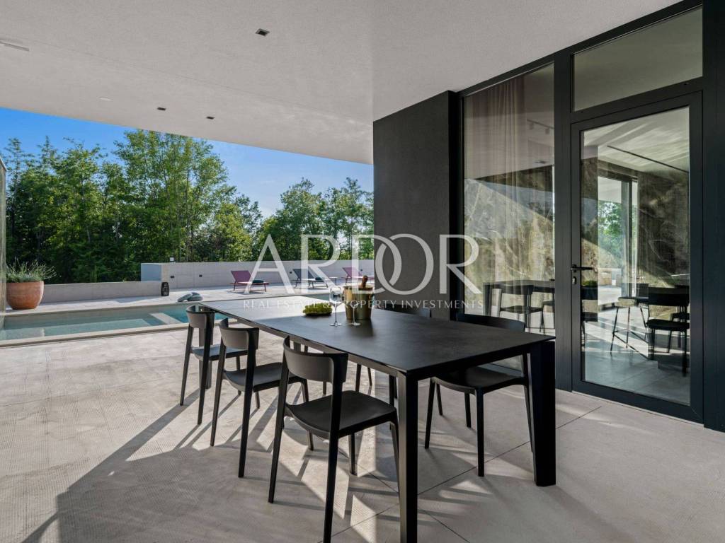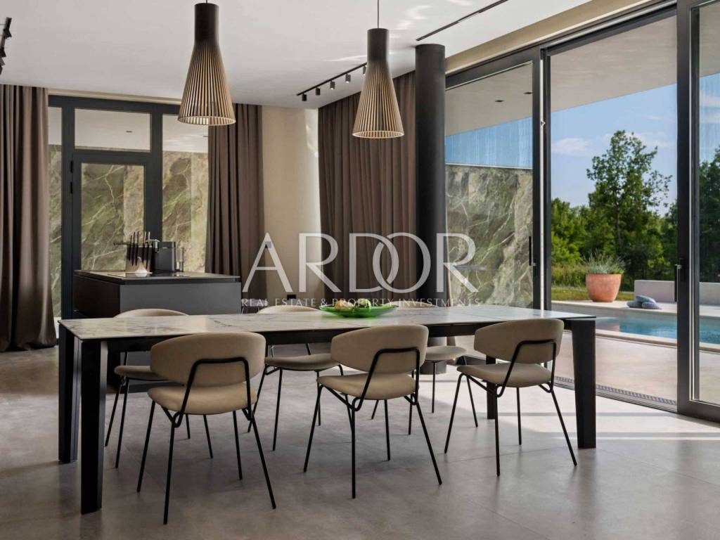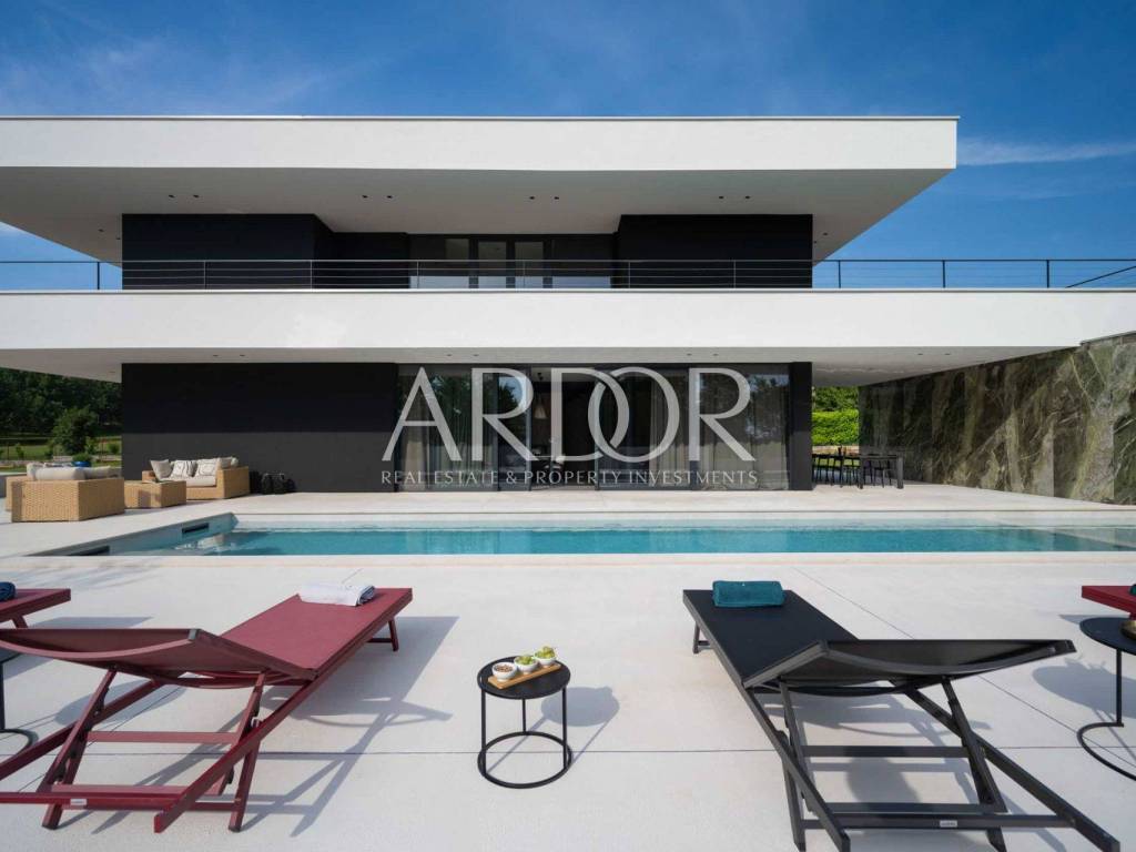 Smještena na mirnoj i slikovitoj lokaciji u blizini Grožnjana, elegantna dizajnerska vila nudi jedinstvenu priliku za život u srcu Istre. Na prostranoj čestici od 2.170 m², okružena prirodom i zelenilom, vila pruža panoramske poglede sa svih strana, stvarajući savršeno mjesto za opuštanje i uživanje u privatnosti.