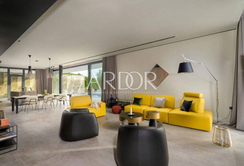 Vanjski prostor osmišljen je za uživanje u slobodnom vremenu i druženjima. U središtu se nalazi bazen s morskom soli površine 61 m², okružen sunčalištem, lounge zonom, vanjskom kuhinjom i blagovaonicom. Uređeni vrt s mediteranskim biljem i travnatim površinama dodatno naglašava ljepotu i funkcionalnost, dok je u dvorištu osigurano više parkirnih mjesta.