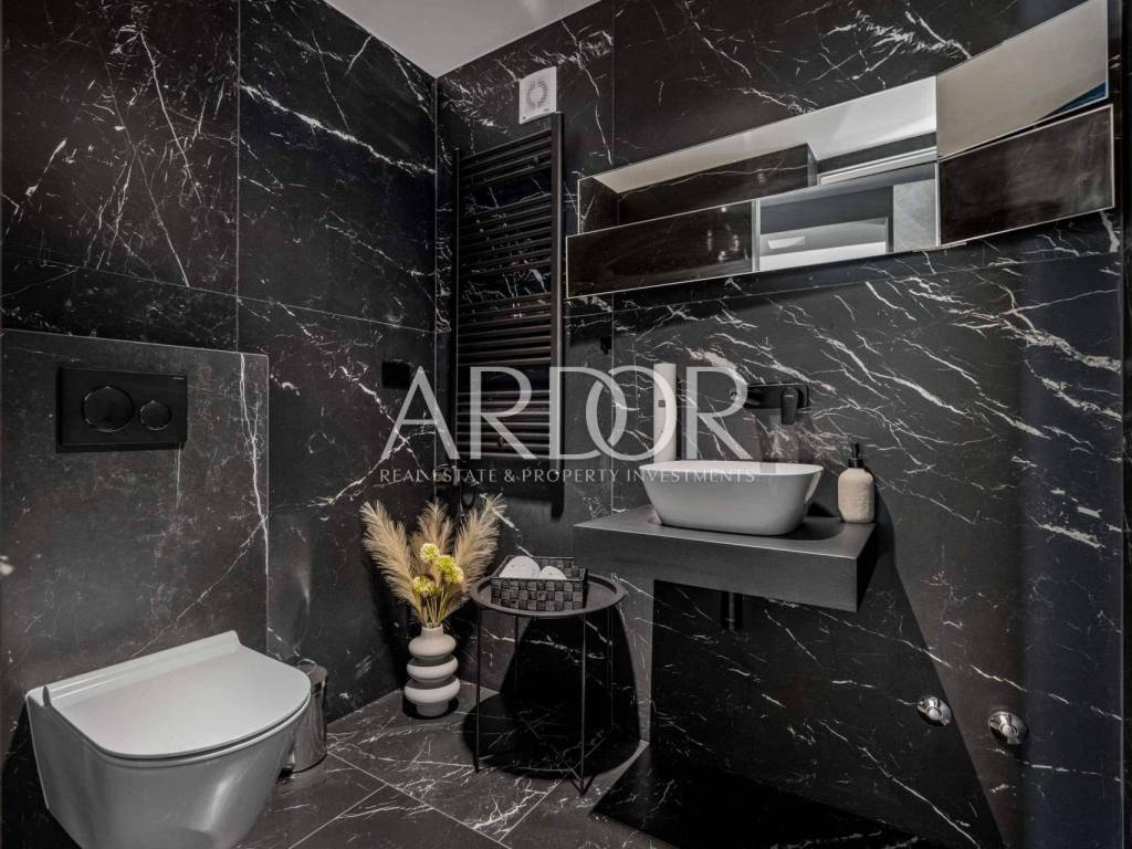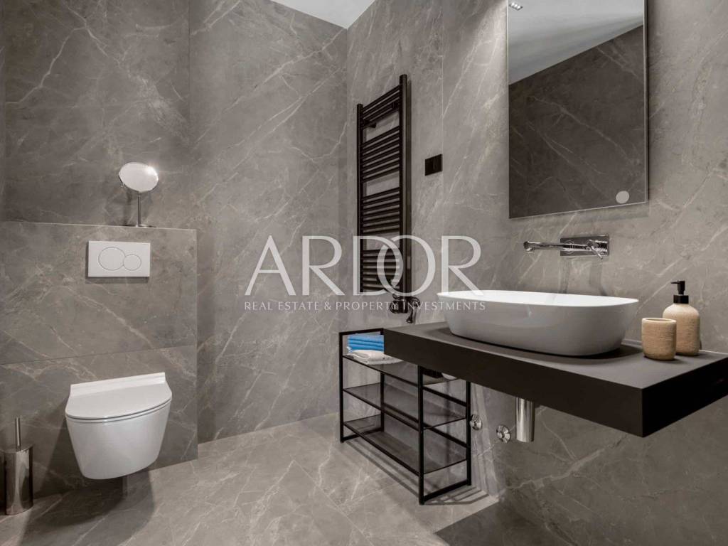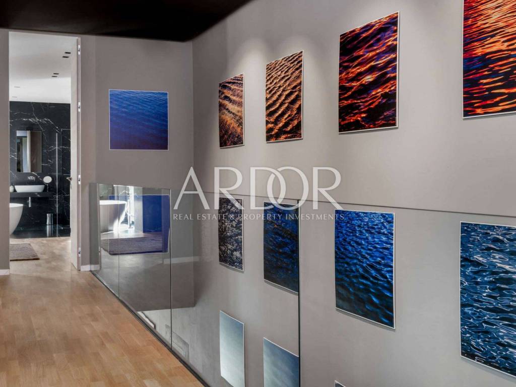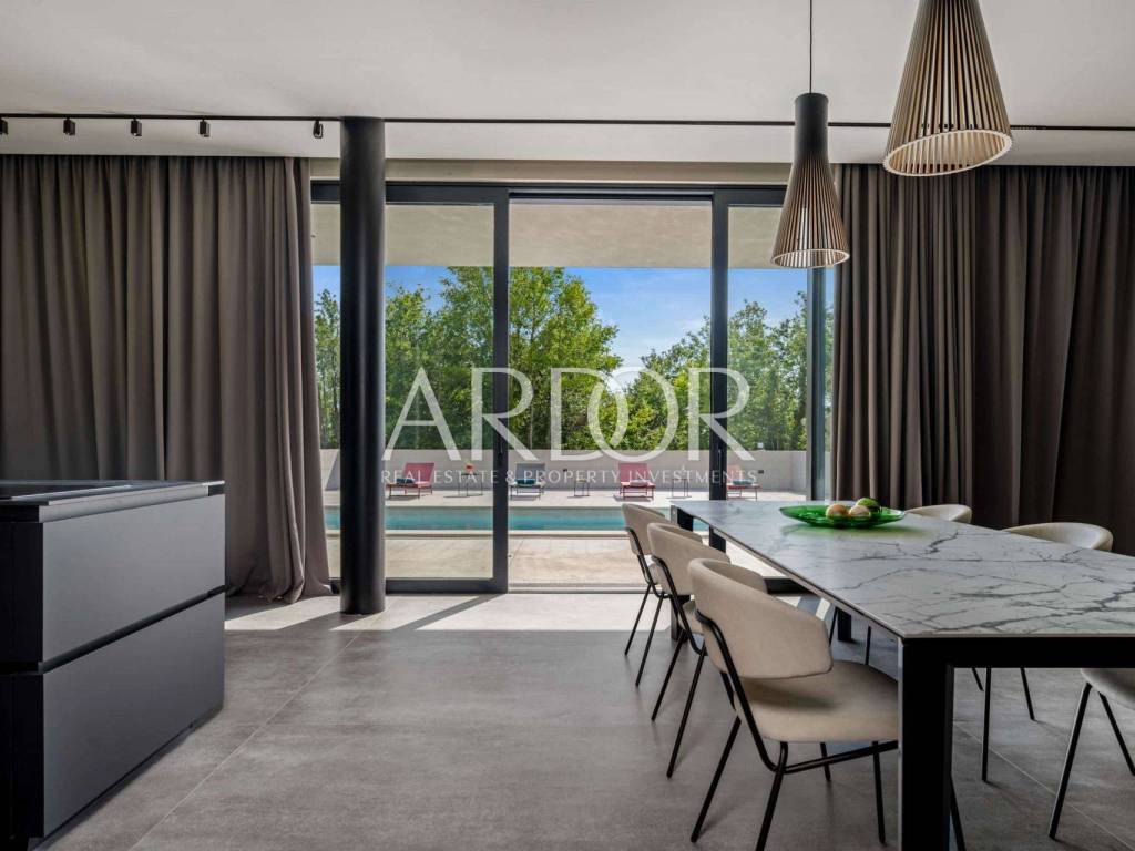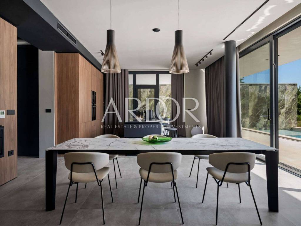 Interijer vile prostire se na 225 m² i oduševljava svojim modernim i funkcionalnim dizajnom prostora raspoređenog na dvije etaže. Prizemlje uključuje ulazni hodnik, prostrani dnevni boravak s otvorenim konceptom dnevnog prostora, kuhinje i blagovaonice, gostinjski toalet te ostavu. Prostor je velikim staklenim stijenama povezan s terasama i uređenim vrtom. Na katu se nalaze tri prostrane spavaće sobe, svaka s vlastitom kupaonicom i izlazom na terasu s neometanim pogledom na okolicu.
