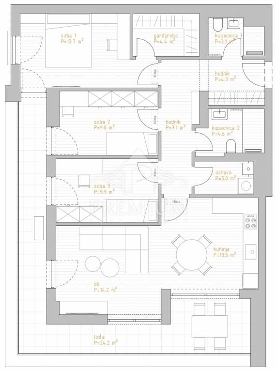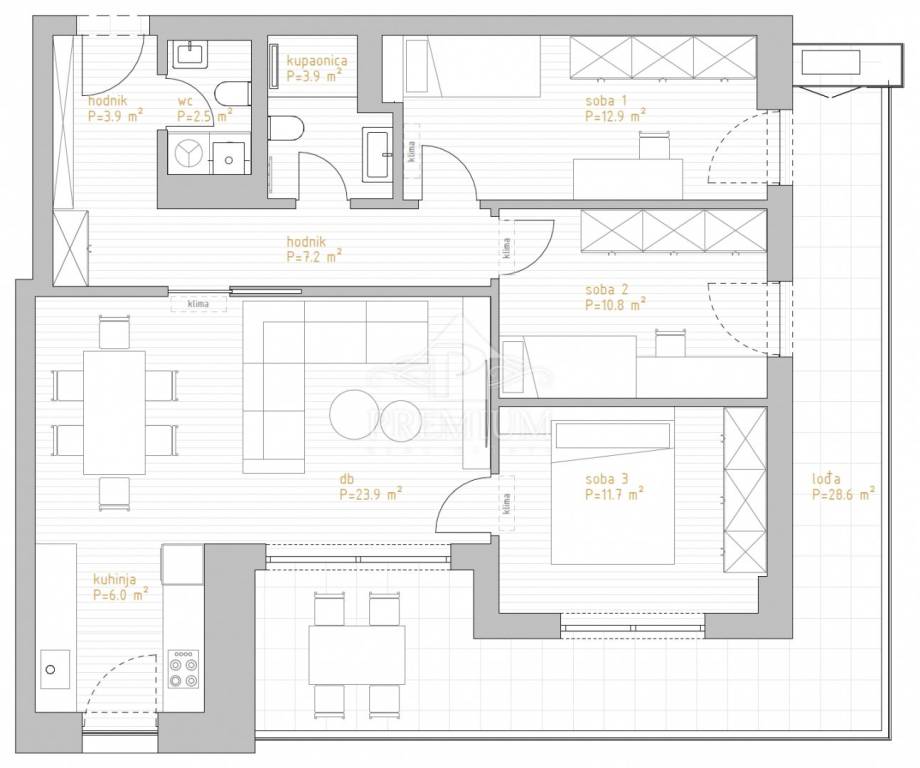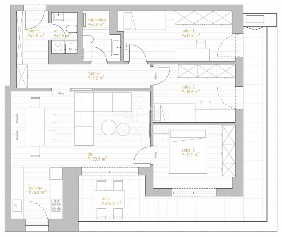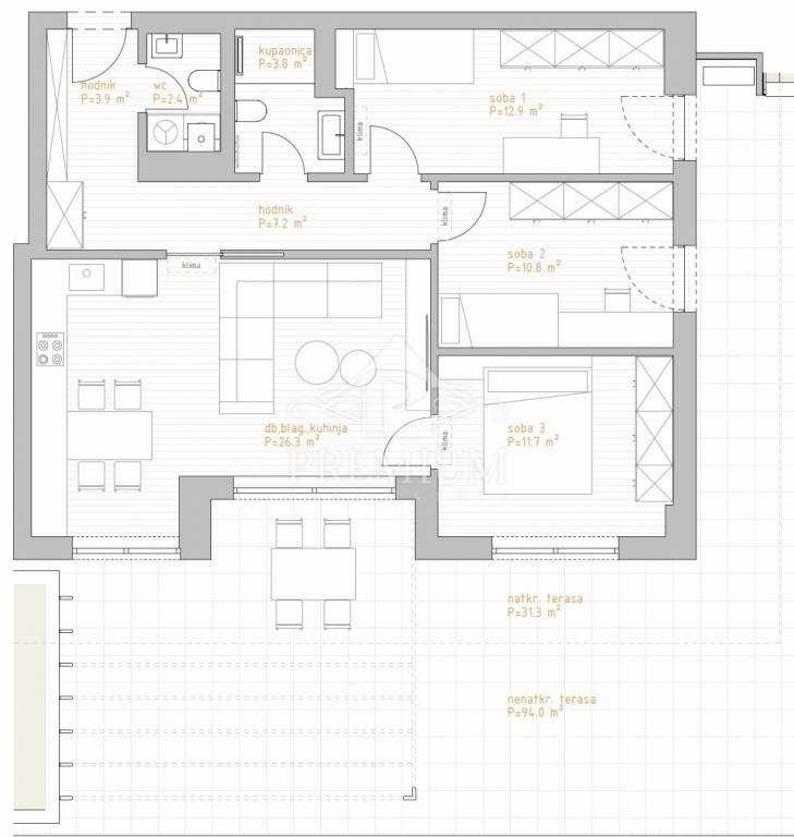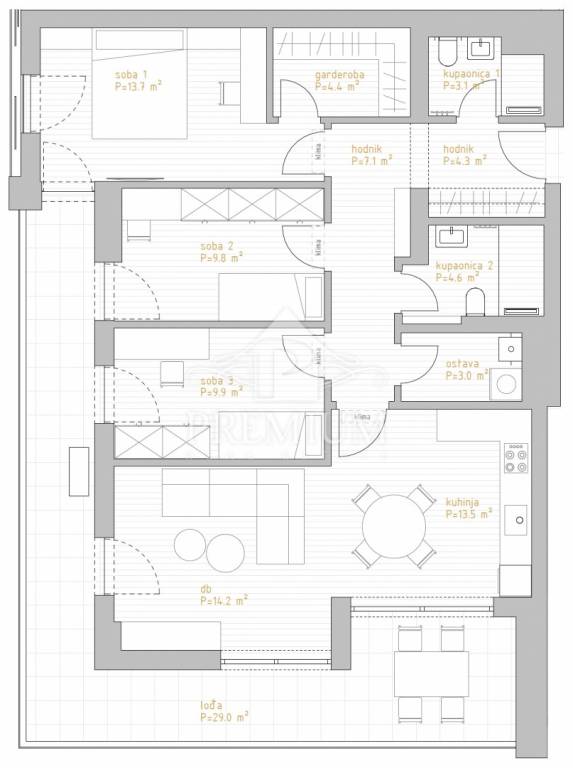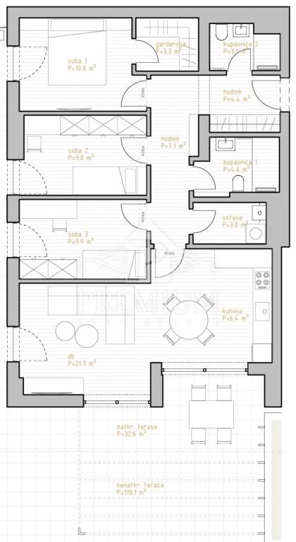 Luksuzni trosobni stanovi sa dnevnim boravkom i površinama od 92,73 do 129,63 m2, sa dva garažna parkirna mjesta i spremištem, koji NISU U CIJENI već se kao zasebna stavka plaćaju, a po želji kupca može se kupiti manji broj parkirnih mjesta od predviđenih.