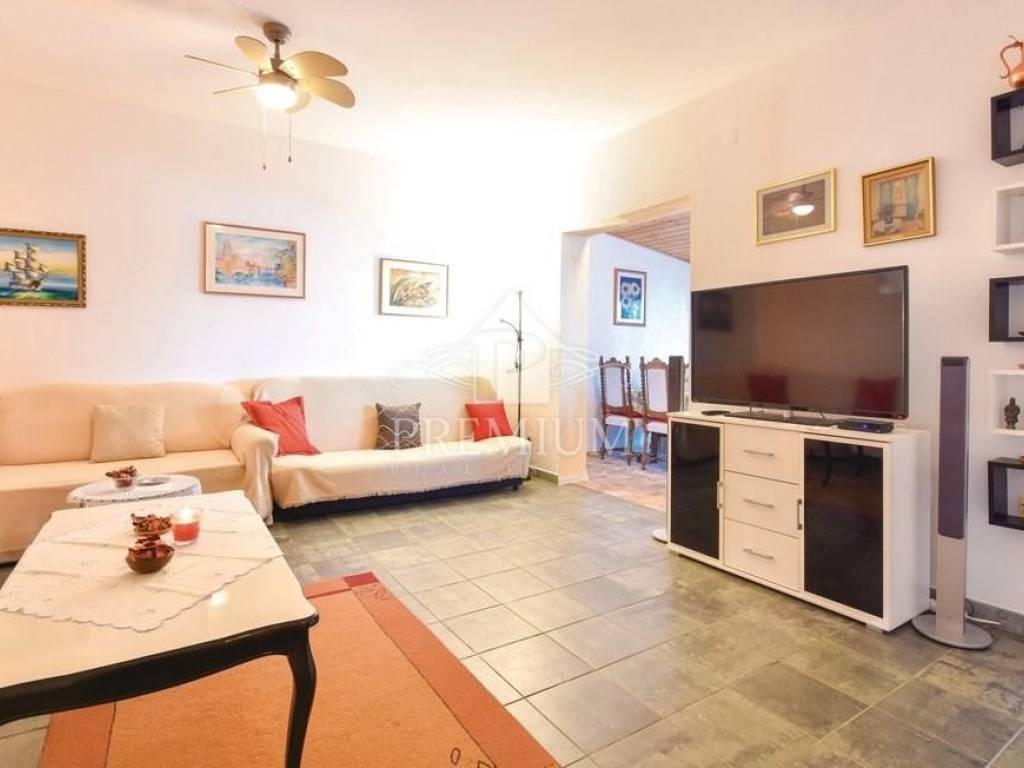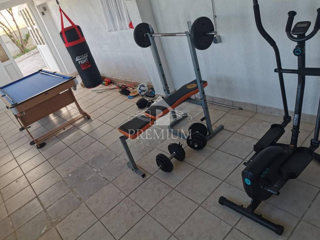 PRIZEMLJE - pošto je konfiguracija terena blagog pada sa stražnje strane kuće je ulaz u zaista veliku garažu (80 m2) gdje dio prostora služi kao ostava. Na ovoj etaži ima i dodatna prostorija od 30m2 sa pogledom na more, nekad ljetna kuhinja a danas prostor pretvoren u mini teretanu odnosno prostor za rekreaciju i zabavu.