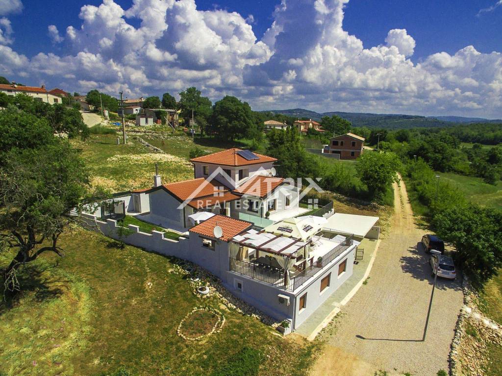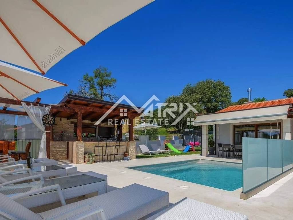 Moderni sadržaji uključuju solarno grijanje s električnom pumpom za vodu, centralno grijanje putem kamina i klima uređaje u svakoj sobi za potpunu udobnost. Vila također ima tri natkrivena parkirna mjesta, alarmni sustav s kamerama i automatsko navodnjavanje travnjaka.