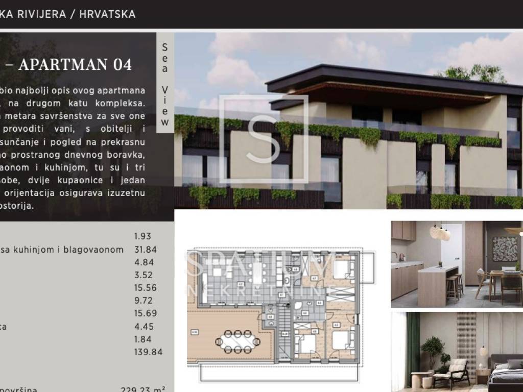 Ovaj fantastičan stan od 89,39m2 površine interijera, smjestio se na drugom katu, kojeg osim izuzetno prostranog dnevnog boravka spojenog s blagovaonicom i kuhinjom, karakterizira prisutnost čak tri spavaće sobe i terase. Također, tu su dvije kupaonice i jedan toalet.