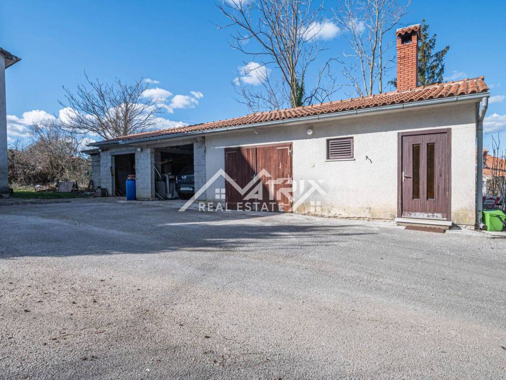 Okućnica od 3026 m2 više je od dvorišta. Za ta ugodna druženja ima i konobu s kaminom. Trebate pohranu? Imamo tri garaže i dodatna parkirna mjesta. Prednji dio okućnice, cca 700m2, namjenjen je građevinskoj namjeni, dok je stražnji dio idealan za poljoprivredne pothvate.